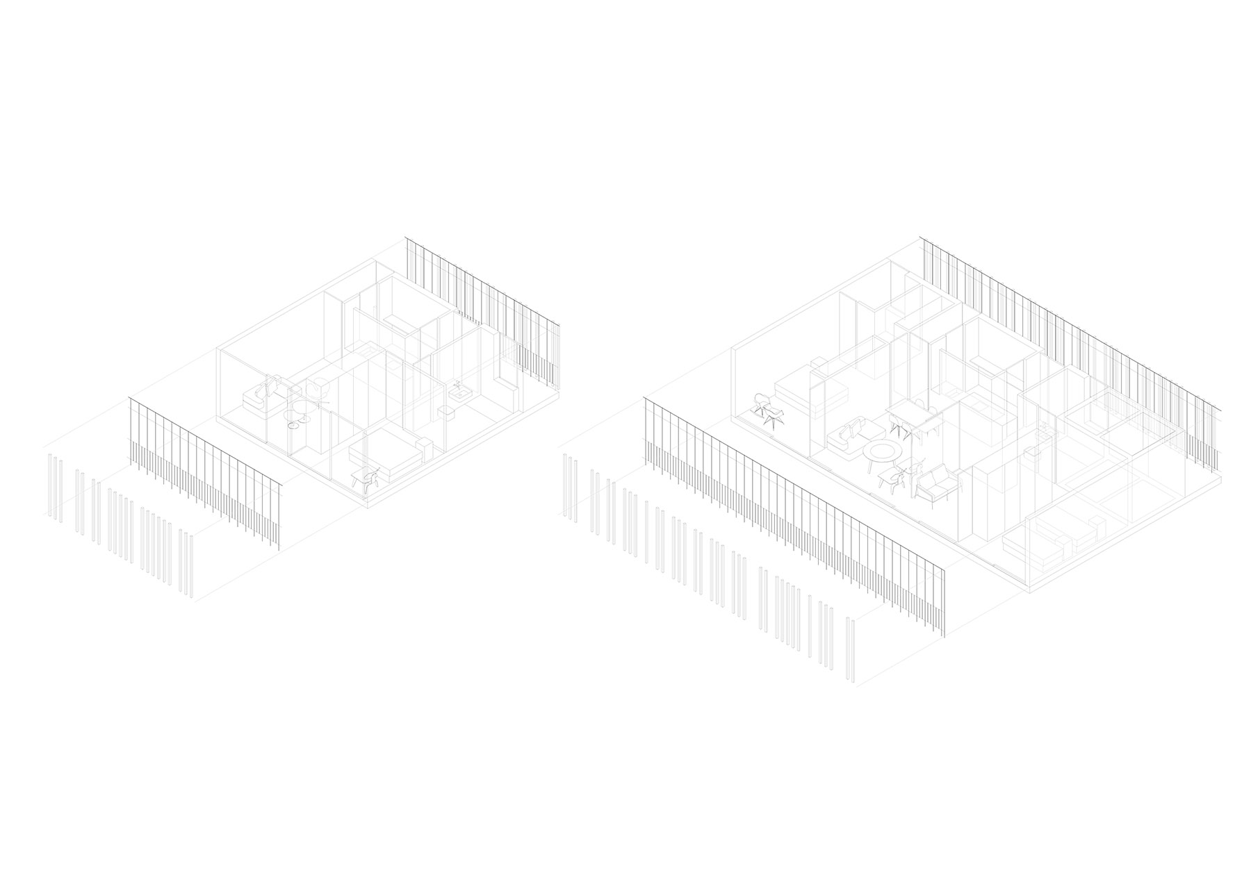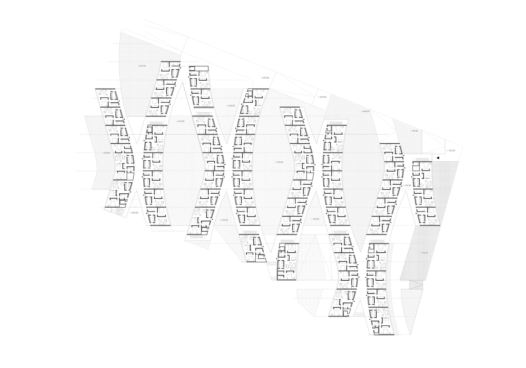 the most characteristic feature of the site is undoubtedly the steep slope that presents, almost 15 meters towards the south orientation, so that it is a very sunny slope. the objective of the project is to find the polite balance between the built masses and the gaps between them. in this way, a management solution is proposed based on a plot, where full and empty spaces are part of the same system, and it is not possible understand one without the other. the plot is of very simple formation, nevertheless the spatial and volumetric results that it produces are surprising for their power and flexibility. these are bays that run parallel to each other in a transverse direction to the slope like banquets, whose e-w guideline is, instead of rectilinear, slightly zigzagging. this smooth zig-zag movement allows you to alternately connect the bays, so that it is possible to go through each level in continuity. at the same time, this movement generates large yards that are counterbalanced quincuncial and are always open to the façade at the ends. the multiplicity of accesses, connections and routes that the plot establishes both between the different levels of the project and within the same level, favors the social relationship and therefore community life. everyone's space is activated, and in this sense, a community use of the roofs as recreational and recreational spaces is also proposed
