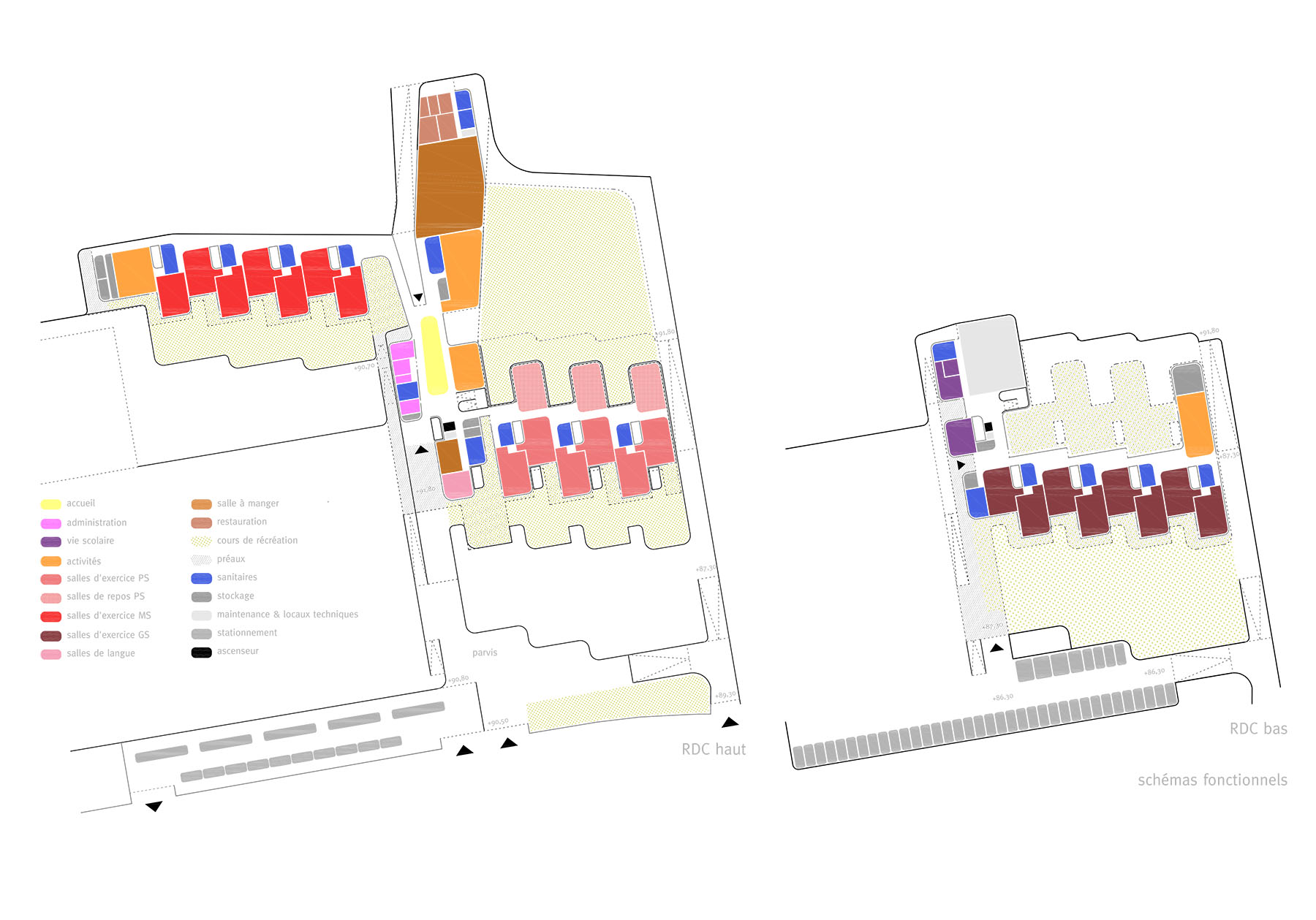 the different exempt pavilion buildings are presented as “objects” built in a landscaped environment that pedestrically connects them through roads and in turn makes them independent by the lushness of the plant mass. within this figure-bottom dichotomy, the proposal proposes the incorporation of the new program as part of the built topography or background plan, and thus collaborate to the rehabilitation of outdoor spaces, and reinforcement and improvement of the entrance spaces, internal routes and planted areas. the strong unevenness existing in the plot causes as a consequence that what is considered as a ground operation, however, has a “facade” or recognizable image of the building from the new access at the bottom point (avenida de los madroños). the provision of the program enhances passive environmental control solutions that make the correct orientation, use of shade its best allies, along with an atomized organization of small courtyards that put light into the heart of the spaces and allow natural cross ventilation, especially favorable in hot weather. the terraced solution produces the splitting of the floor plans in recreational gardens individualized by age and in turn becomes pedestrian connection planes that allow traffic both "through" and "over" the building.