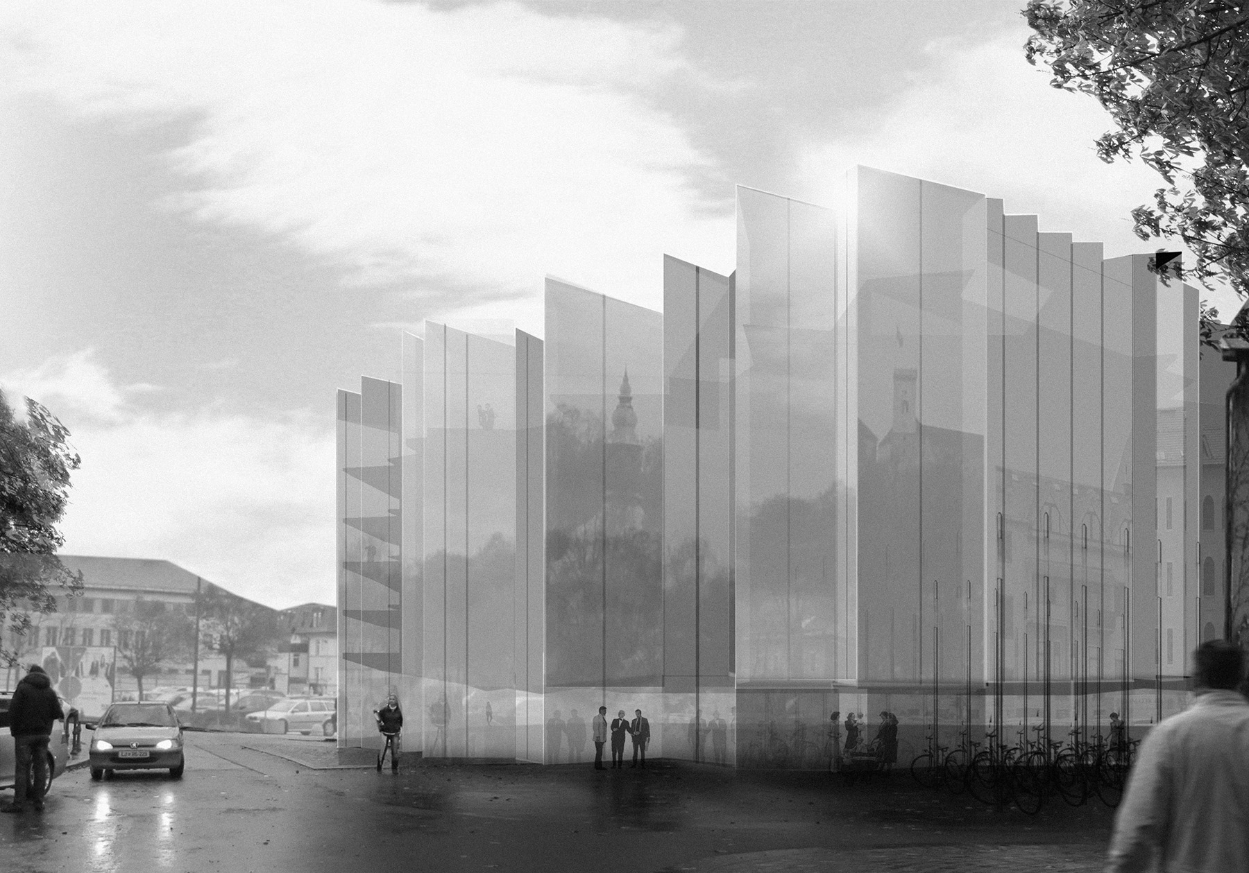 the mesh has been dimensioned and orientated as the ruins of emona and as a result of the adjustment three different directions are introduced on top of the existing layers, working in a coherent way with the ruins but a lot more free.