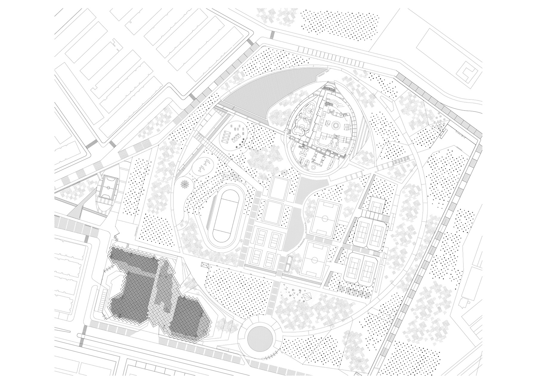 -sports spaces meet slightly to soften the impact of their height, building a new accessible topography that results in better integration into the park.