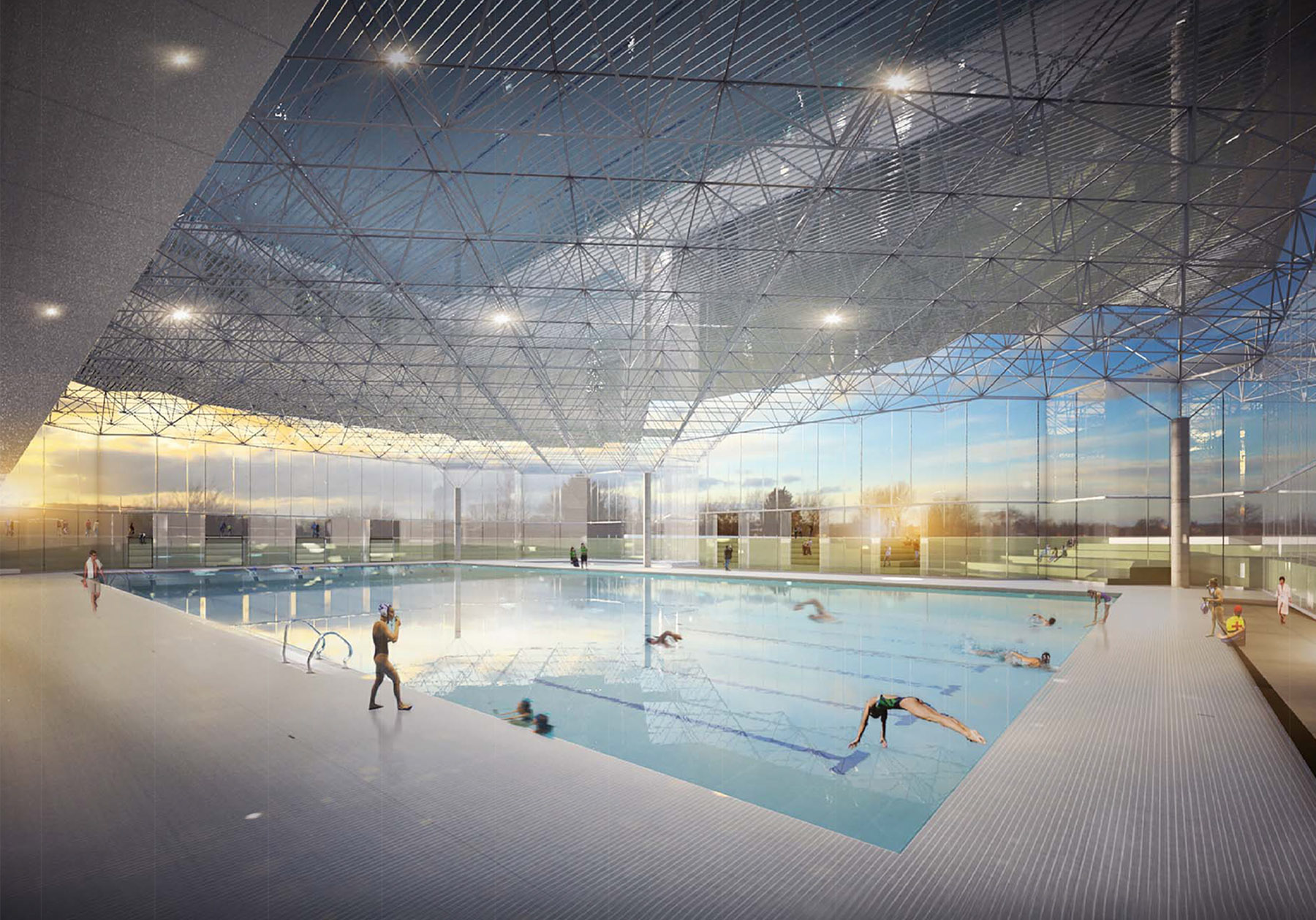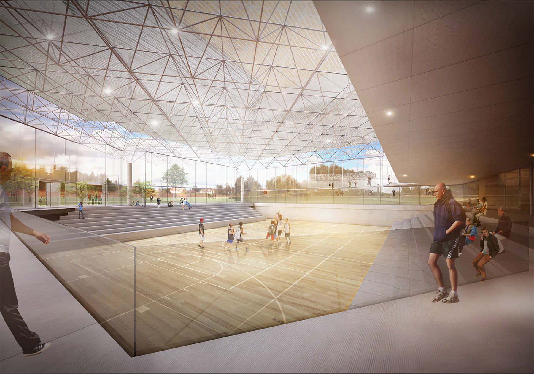 -between the main sports volumes a threshold is generated, which is allowed to cross when the park is open, turning the project itself into a new entrance.