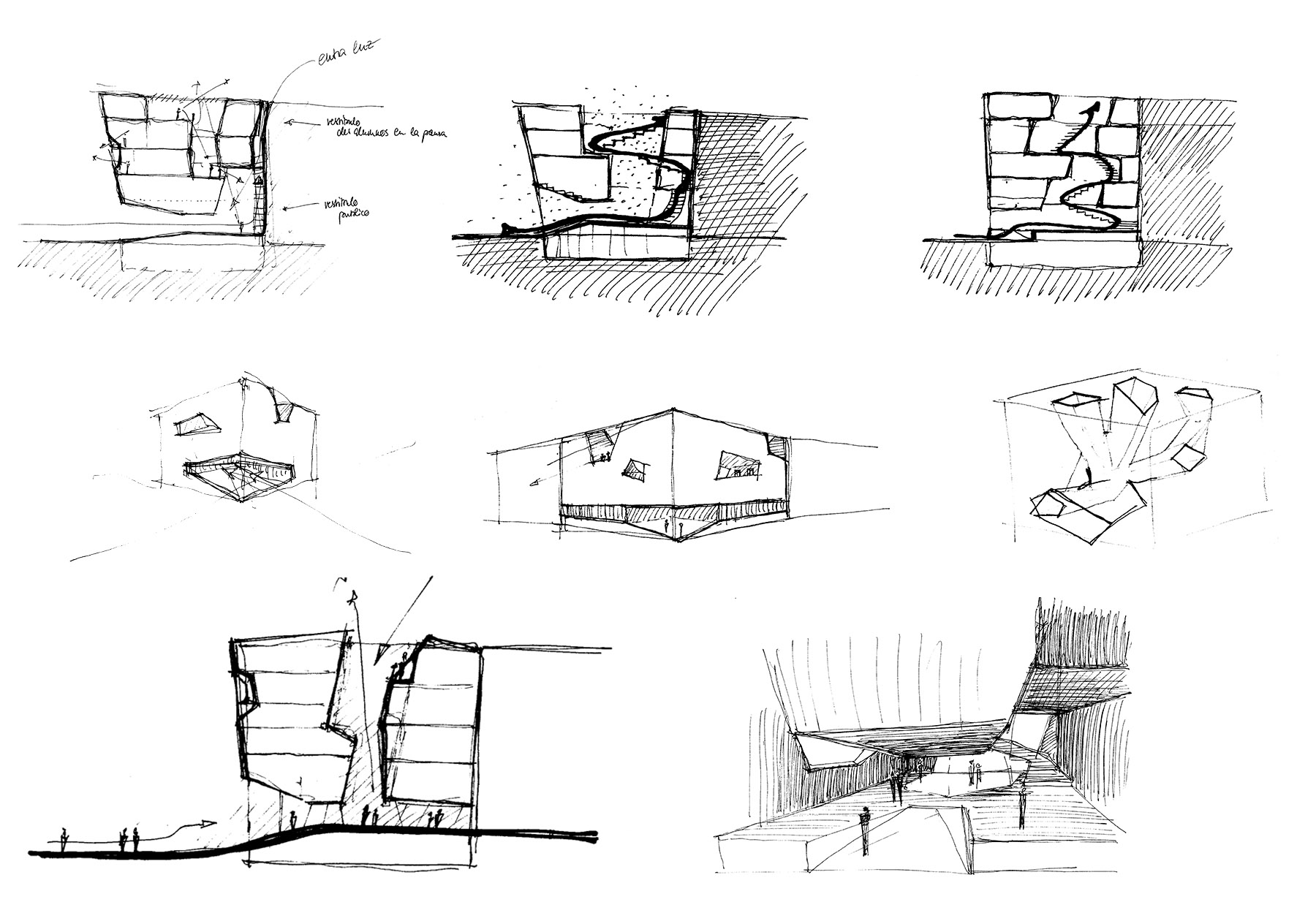 on the other hand, the conservatory program is set out in thematic blocks that need to be related to achieve a unitary project without differentiated parts. in this way we decided to merge the dance and music programs and then establish a new functional hierarchy in height; lower public traffic as it rises (also smaller rooms). in addition, the geometry of the site, practically square, together with the fact that it is a corner, hinders the traditional understanding of “front and back”, “left and right” and suggests the need to drill the large volume that can be offers to put light and air to the heart of an almost isotropic mass. these drillings are one or multiple, it is a braid of gaps that define spaces by their relative position.