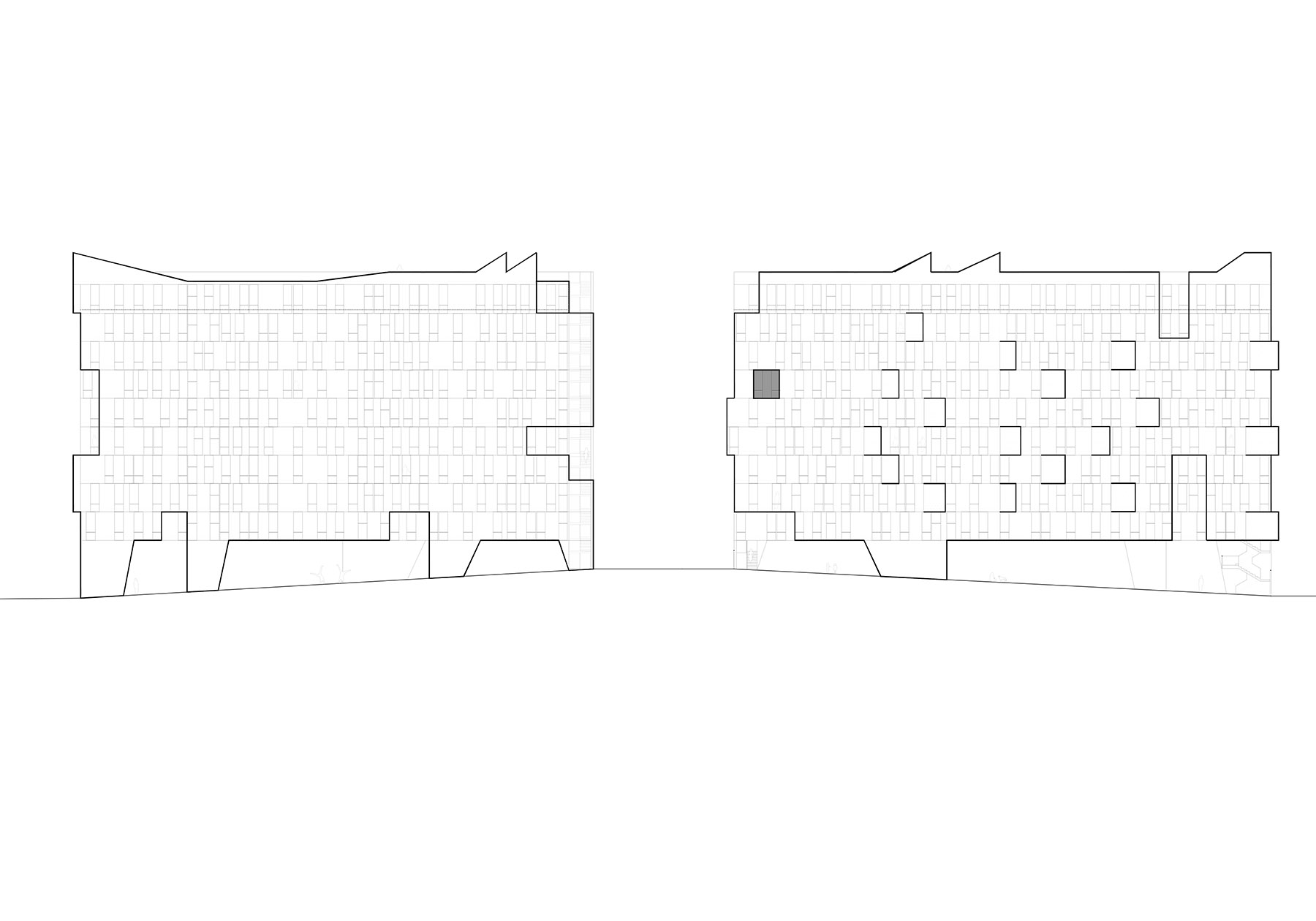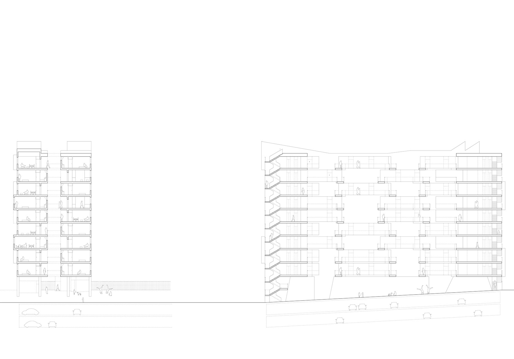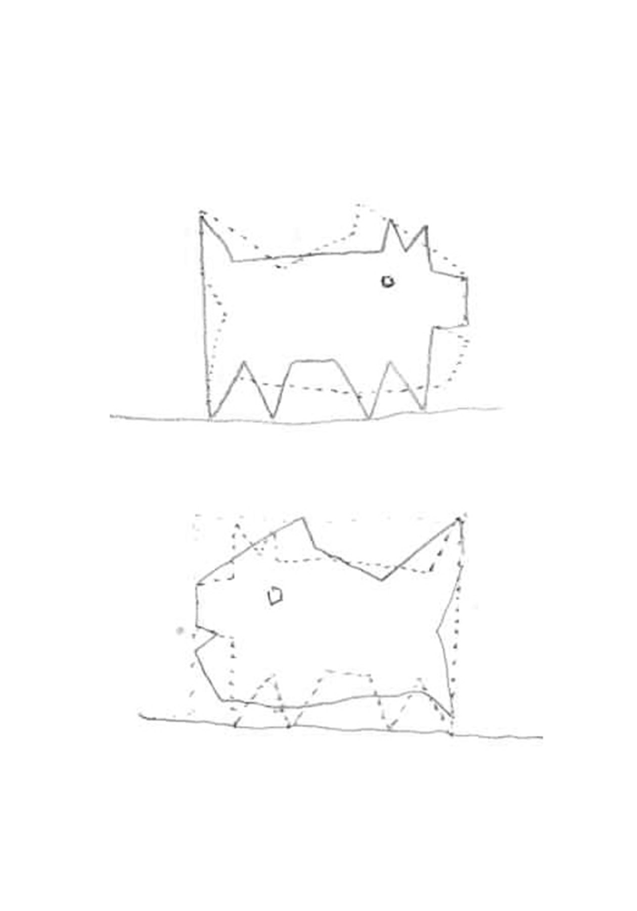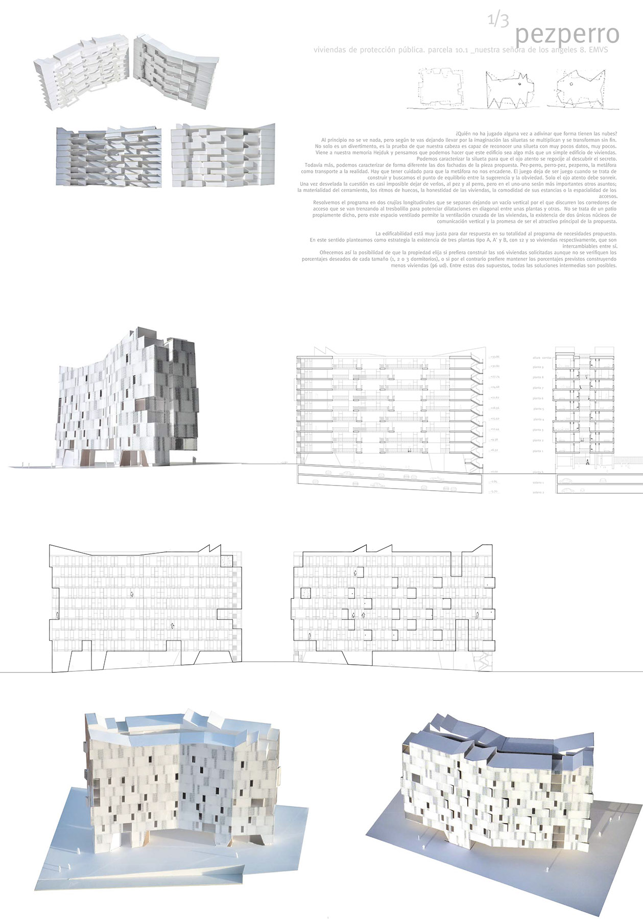 at first you don't see anything, but as you get carried away by imagination, the silhouettes multiply and transform endlessly. it is not only a diversion, it is the proof that our head is able to recognize a silhouette with very few data, very few. even more, we can characterize the two facades of the proposed piece differently. fish-dog, dog-fish, pezperro, the metaphor as a transport to reality. we must be careful so that the metaphor does not chain us. the game ceases to be a game when it comes to building and we look for the balance between suggestion and obviousness. only the attentive eye should smile. once the question is revealed, it is almost impossible to stop seeing them, the fish and the dog, but in the one-one other matters will be more important; the materiality of the enclosure, the rhythms of gaps, the honesty of the houses, the comfort of their rooms or the spatiality of the accesses. we solve the program in two longitudinal bays that separate leaving a vertical void through which the access corridors that cross quincuncial run to promote diagonal dilations between some plants and others. it is not a courtyard itself, but this naturally ventilated and ventilated space allows cross-ventilation of the homes, the existence of only two vertical communication centers and the promise of being the main spatial attraction of the proposal.