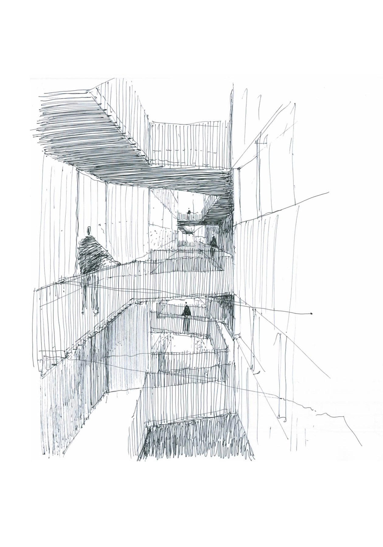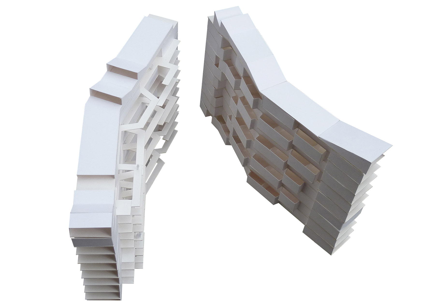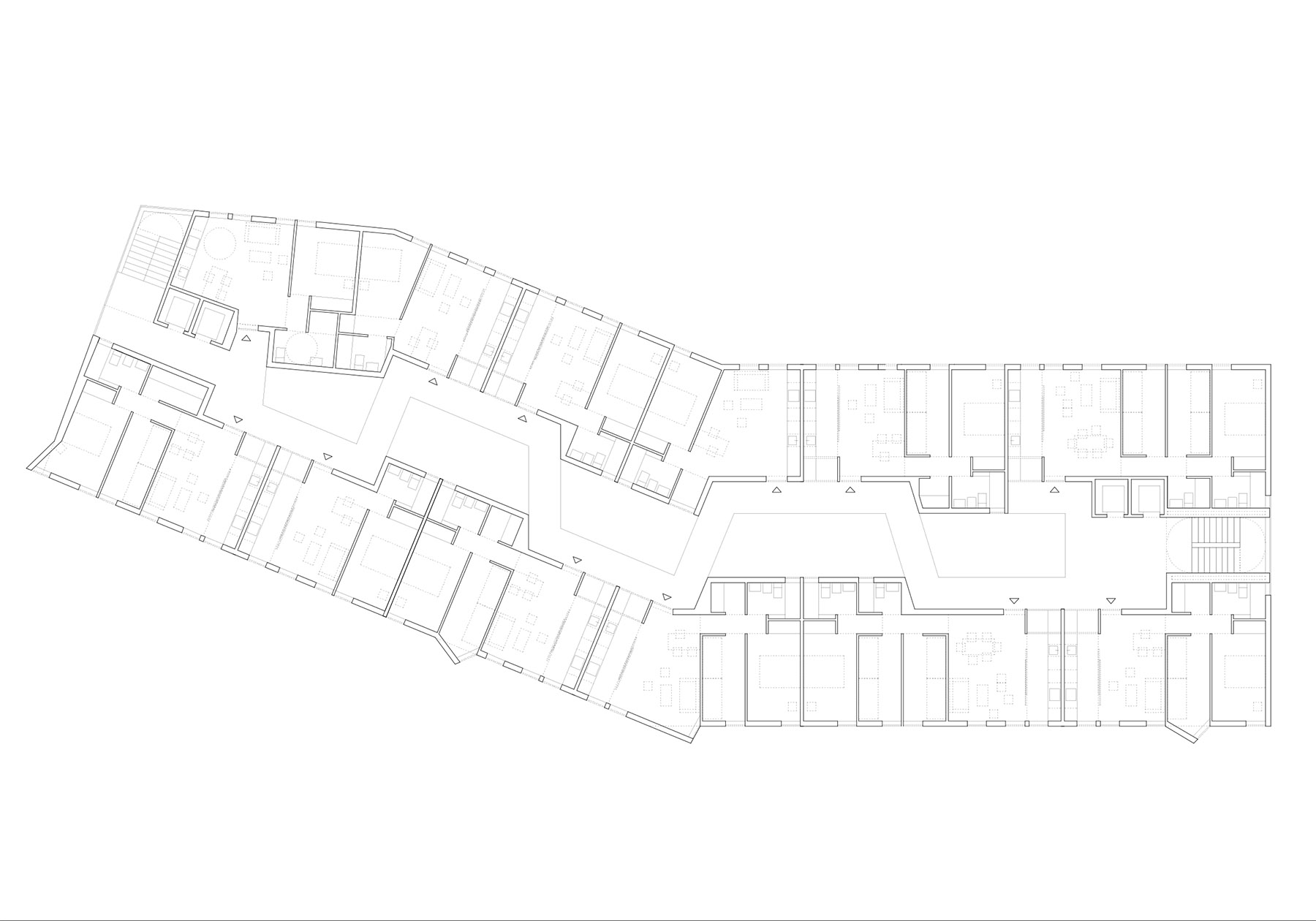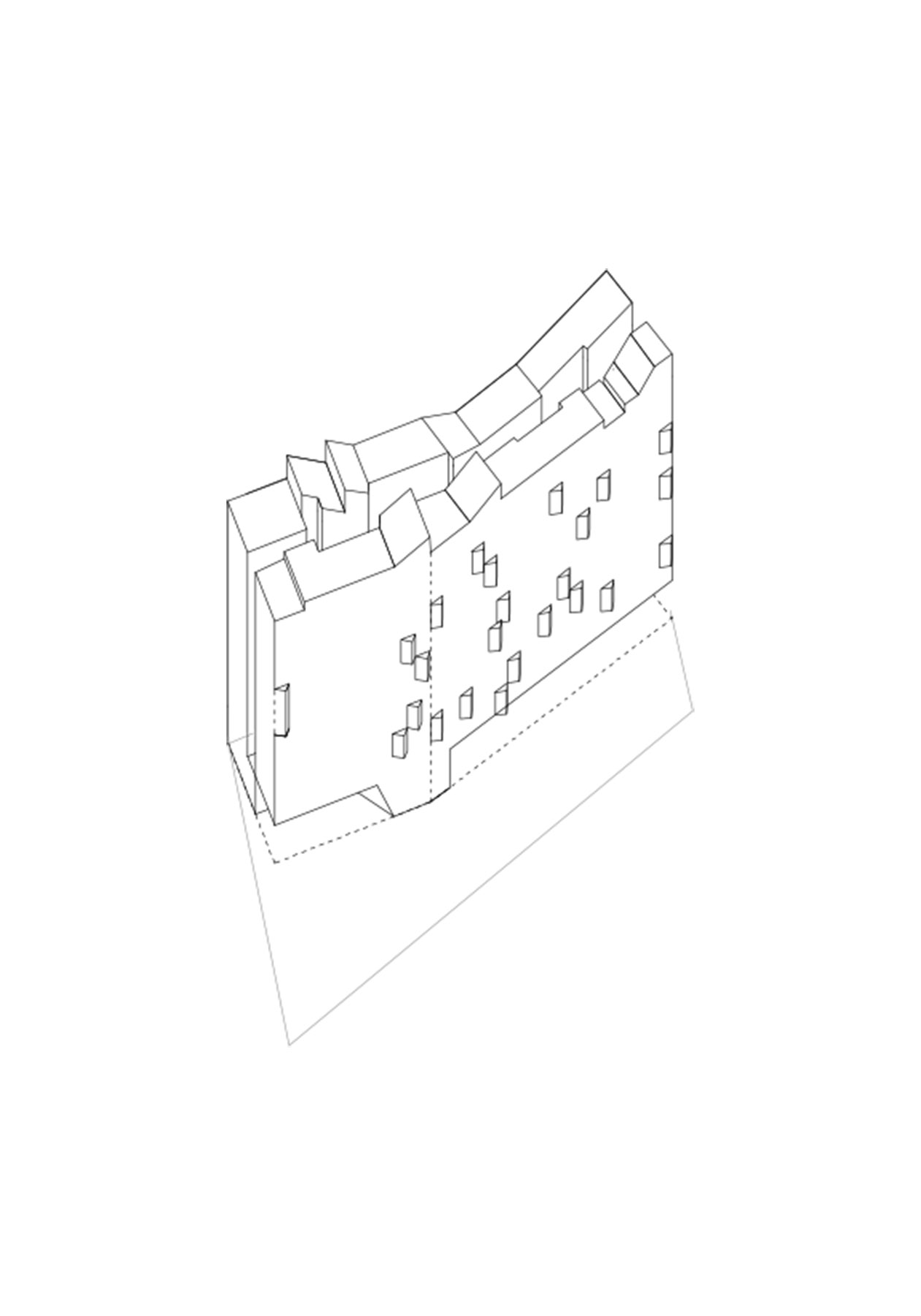 at first you don't see anything, but as you get carried away by imagination, the silhouettes multiply and transform endlessly. it is not only a diversion, it is the proof that our head is able to recognize a silhouette with very few data, very few. even more, we can characterize the two facades of the proposed piece differently. fish-dog, dog-fish, pezperro, the metaphor as a transport to reality. we must be careful so that the metaphor does not chain us. the game ceases to be a game when it comes to building and we look for the balance between suggestion and obviousness. only the attentive eye should smile. once the question is revealed, it is almost impossible to stop seeing them, the fish and the dog, but in the one-one other matters will be more important; the materiality of the enclosure, the rhythms of gaps, the honesty of the houses, the comfort of their rooms or the spatiality of the accesses. we solve the program in two longitudinal bays that separate leaving a vertical void through which the access corridors that cross quincuncial run to promote diagonal dilations between some plants and others. it is not a courtyard itself, but this naturally ventilated and ventilated space allows cross-ventilation of the homes, the existence of only two vertical communication centers and the promise of being the main spatial attraction of the proposal.