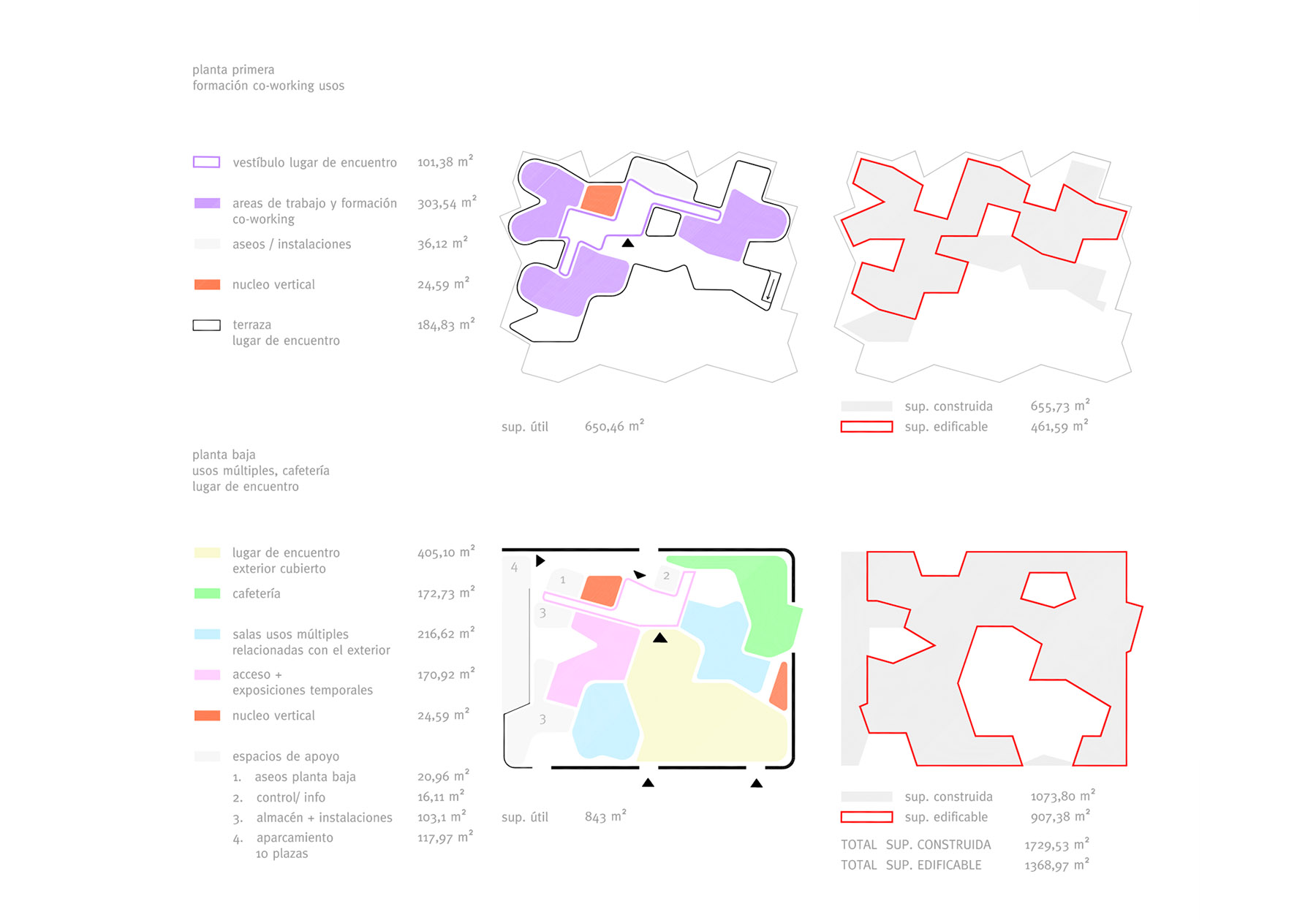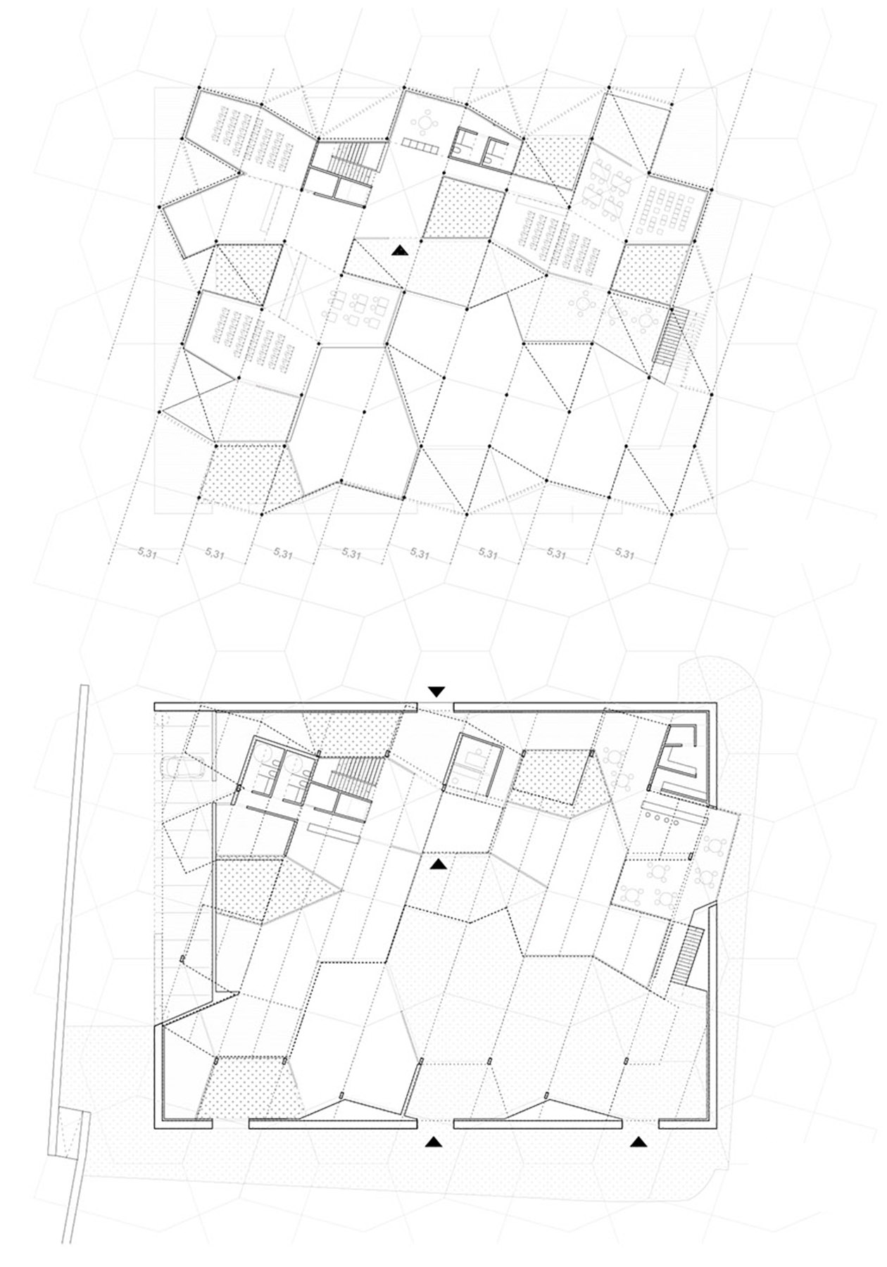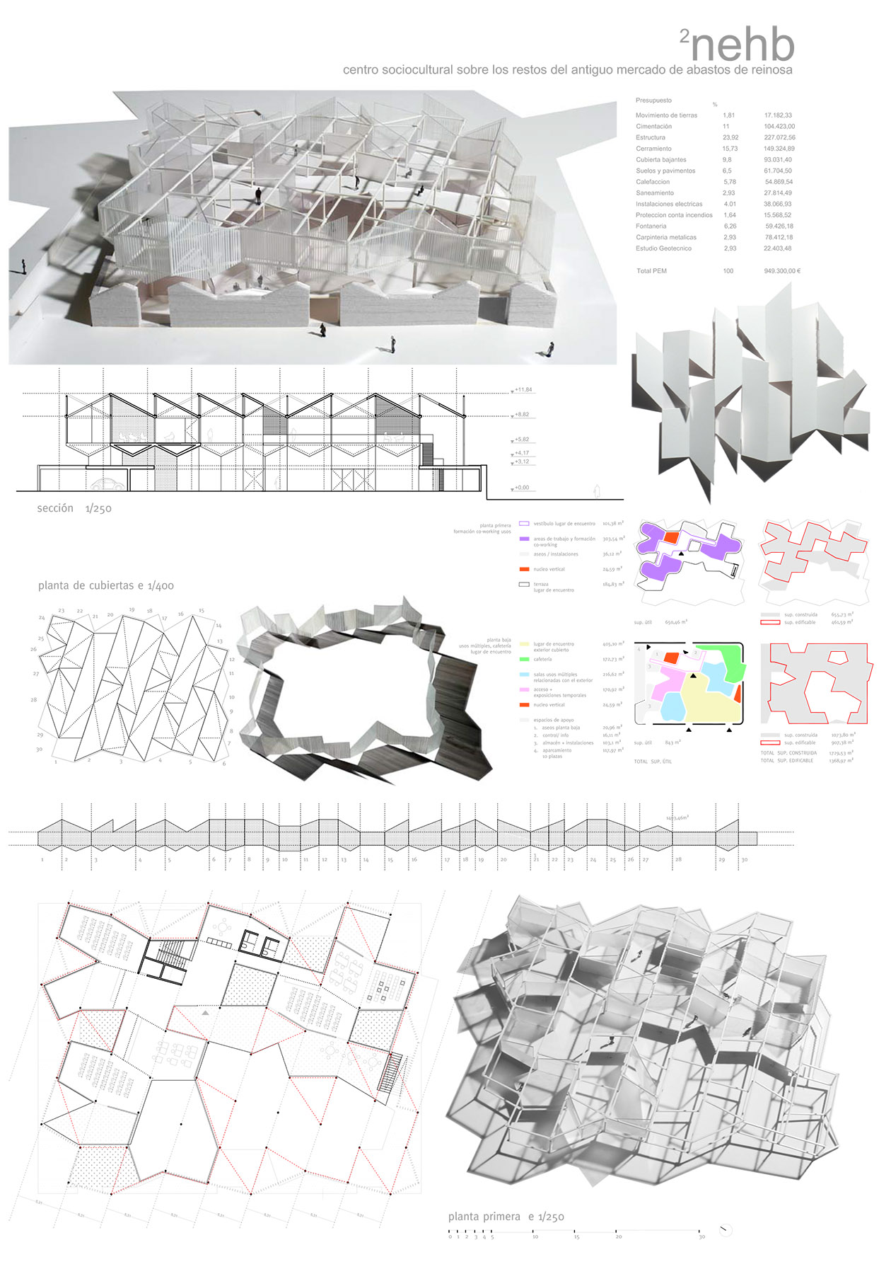 the building for the new cultural center of reinosa aims to generate a structure within the city that responds to multiple activities associated with culture, leisure and meeting places, where to put ideas into practice with economic activity. for this reason, the building shares its constructive and functional logic in one part with those typologies traditionally associated with sports, industrial and exhibition uses. the geometry of the building is organized on an underlying structure that has the will to order the spaces in a flexible way with all the concatenated areas. we use the mesh of the cairo, formed by 2 meshes of hexagons superimposed and rotated 90º. a deformation is introduced in an axis of said structure so that the main direction of the building is on horseback between the width and the length, appearing the diagonal that makes the program grouping more flexible while facing the south orientation. the functional program is solved in two floors. the ground floor where a large exterior void, semi-covered meeting place, orders around part of the program such as the cafeteria, access, multipurpose room, exhibitions and local servers and parking. on the top floor the program that could well be spaces for training and co-working is organized in several bays that turn over the main void.
