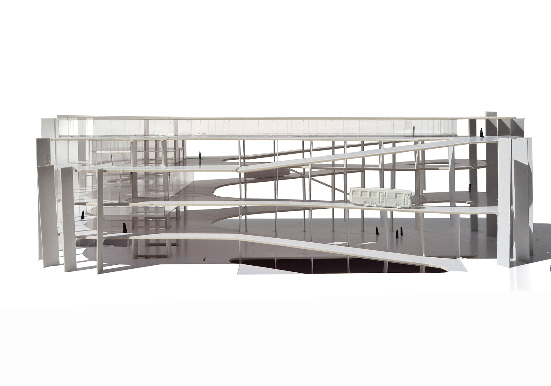 saying 'this is not a ramp', echoing magritte, challenges what we think we see. it invites us to question how we perceive the world. regulations explain that a surface with a 4% slope is, for practical purposes, the same as being flat, meaning it is not considered a ramp. many streets in madrid are like this, gently sloping. walking uphill takes a bit more effort than going down, yet these streets are so familiar that we barely notice them. this museum works in a similar way, as if it were an extension of the street itself, where buses, bikes, and families of all kinds move around. it becomes difficult to tell what is part of the exhibition and what is not. the buses appear as though they were in real service, moving up and down the street, much like the well known story about wrights guggenheim.