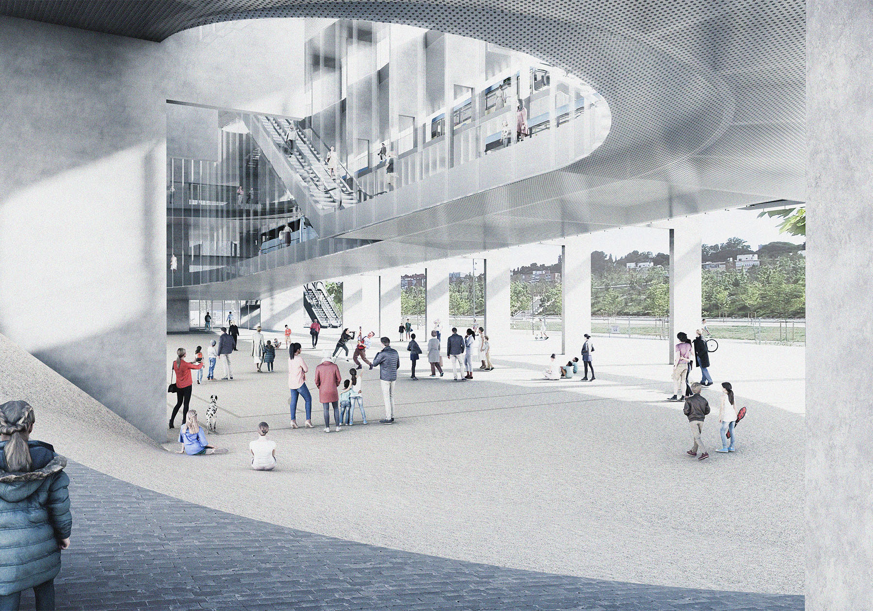 the museum stands out not because it tries to be unique, but because it is clear, strong, and easy to read. its height and structure resonate with the neighboring residential building, defining the street with precision. at the same time, it is porous and very open to movement and sight. by unfolding public space vertically, two conditions can coexist: an outdoor entrance atrium and a large multifunctional interior void, ready to host activities ranging from sports to performances, celebrations, or installations. there is also a direct path leading to the roof, a raised plaza that satisfies an innate desire to climb and see farther, and perhaps enjoy a drink while doing so. inside, any moment can capture and freeze the constant motion of the place, recalling the atmosphere of memorable parking structures, with their uninterrupted flow of views, actions, movements, and relationships with others, with past moments, and with those still to come. it becomes a sequence of events inhabiting a single infrastructure, always the same yet always different.