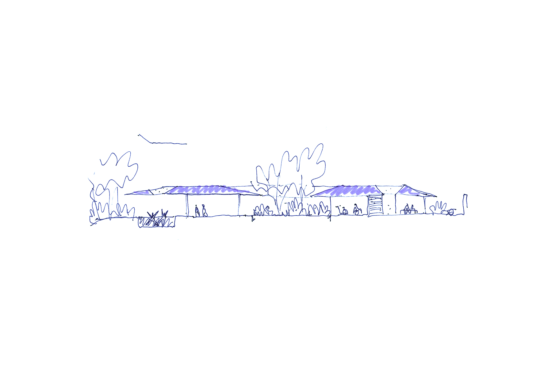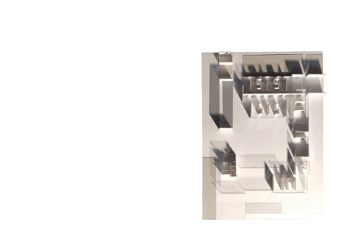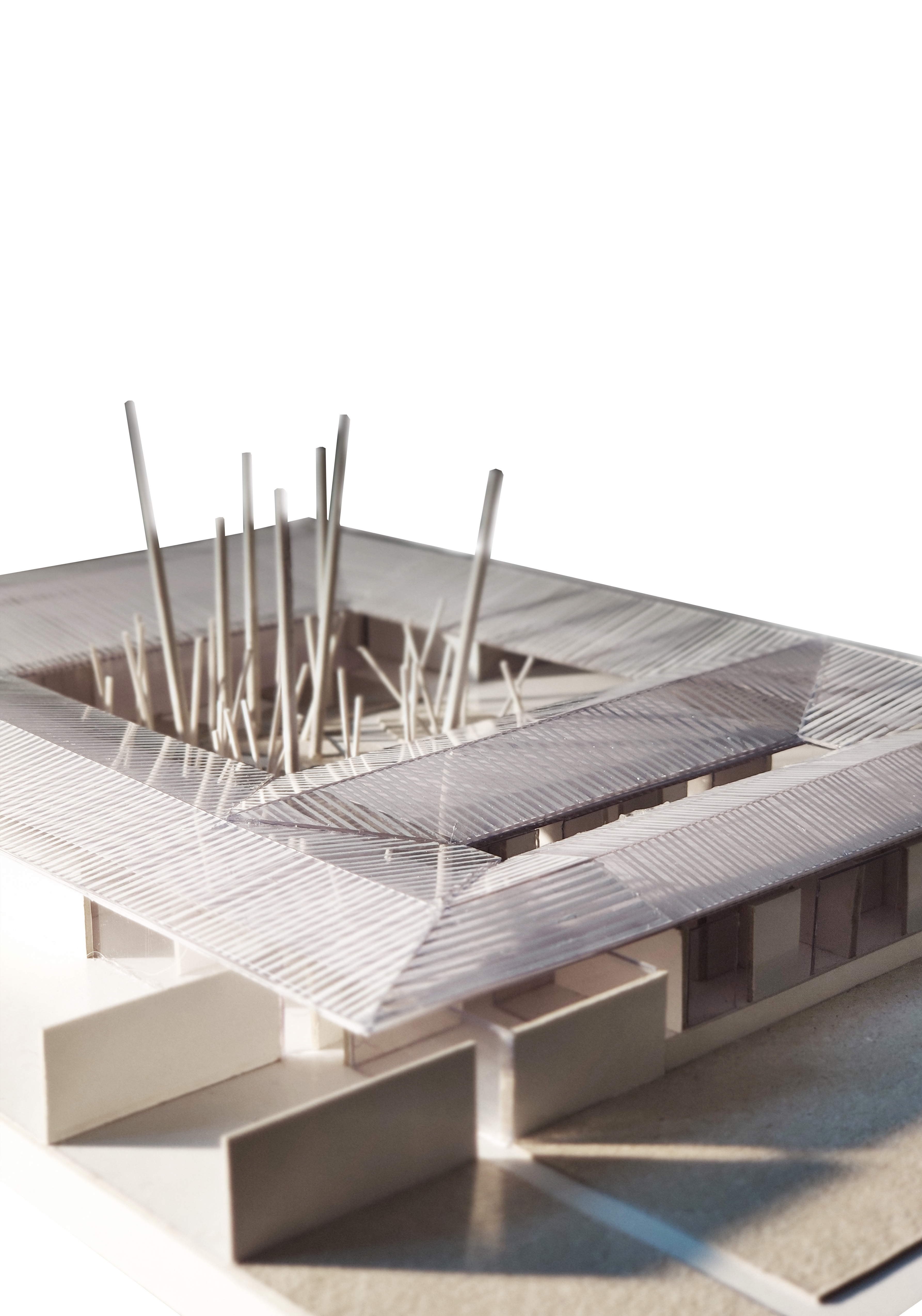 the whole house is united under a great roof of sharp edges to give a ligh-weight illussion to the structure, the materiality of this roof is made up of slim, long, white pieces that leave opaque, translucent or comlpetely transparent areas as a kind of light filter to mitigate the harsh abu dhabi sun.