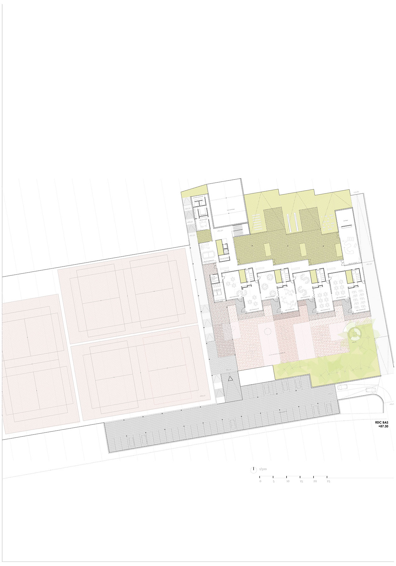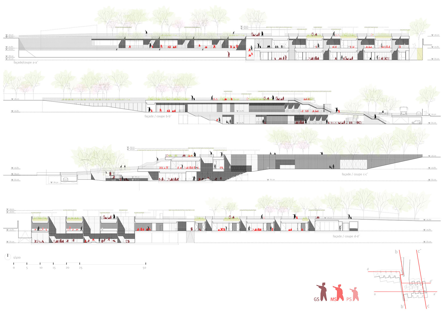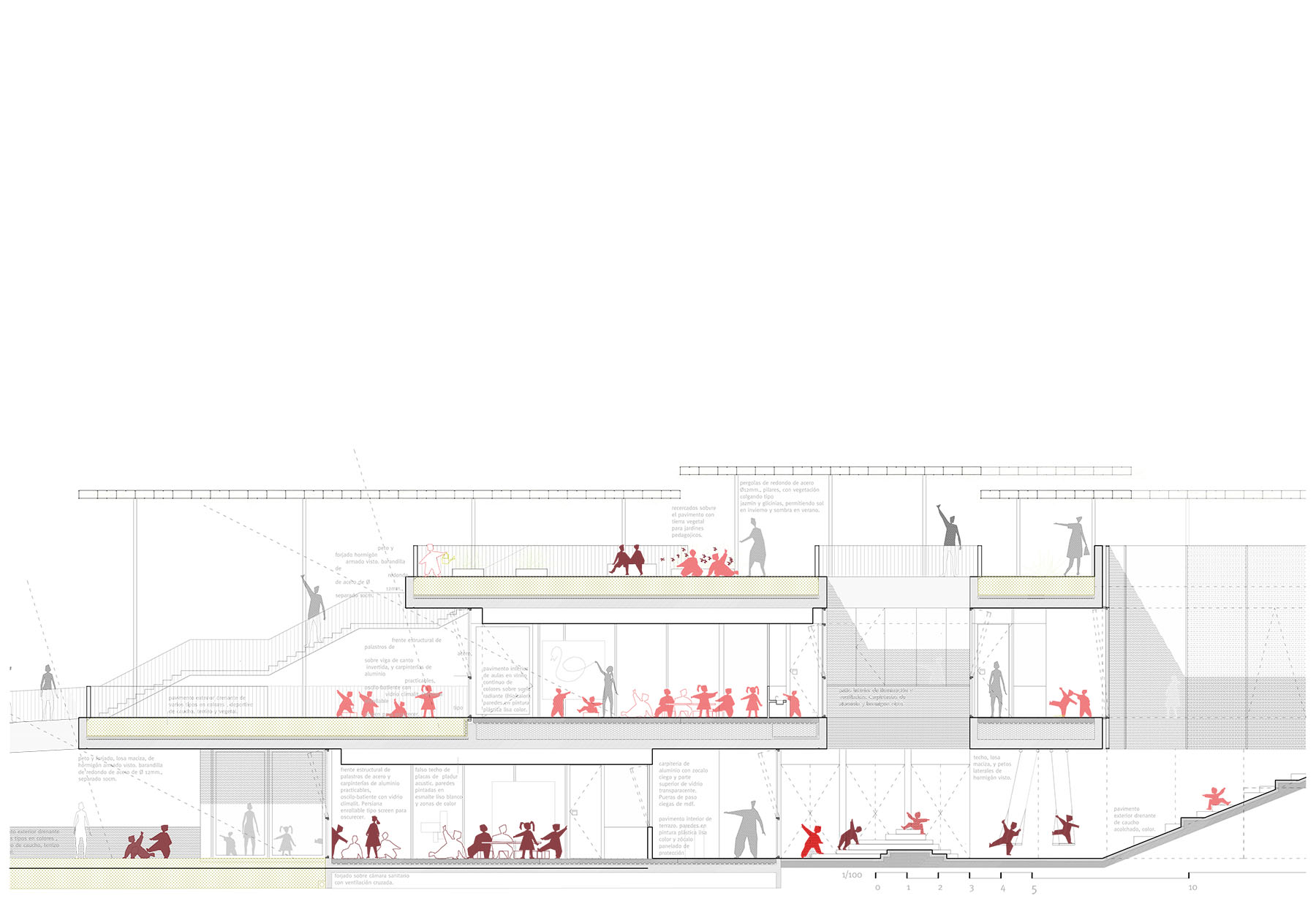 the different exempt pavilion buildings are presented as “objects” built in a landscaped environment that pedestrically connects them through roads and in turn makes them independent by the lushness of the plant mass. within this figure-bottom dichotomy, the proposal proposes the incorporation of the new program as part of the built topography or background plan, and thus collaborate to the rehabilitation of outdoor spaces, and reinforcement and improvement of the entrance spaces, internal routes and planted areas. the strong unevenness existing in the plot causes as a consequence that what is considered as a ground operation, however, has a “facade” or recognizable image of the building from the new access at the bottom point (avenida de los madroños). the provision of the program enhances passive environmental control solutions that make the correct orientation, use of shade its best allies, along with an atomized organization of small courtyards that put light into the heart of the spaces and allow natural cross ventilation, especially favorable in hot weather. the terraced solution produces the splitting of the floor plans in recreational gardens individualized by age and in turn becomes pedestrian connection planes that allow traffic both "through" and "over" the building.