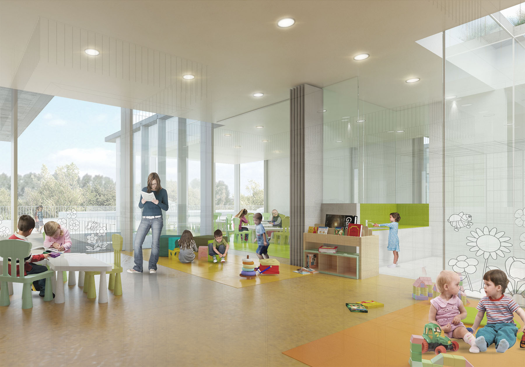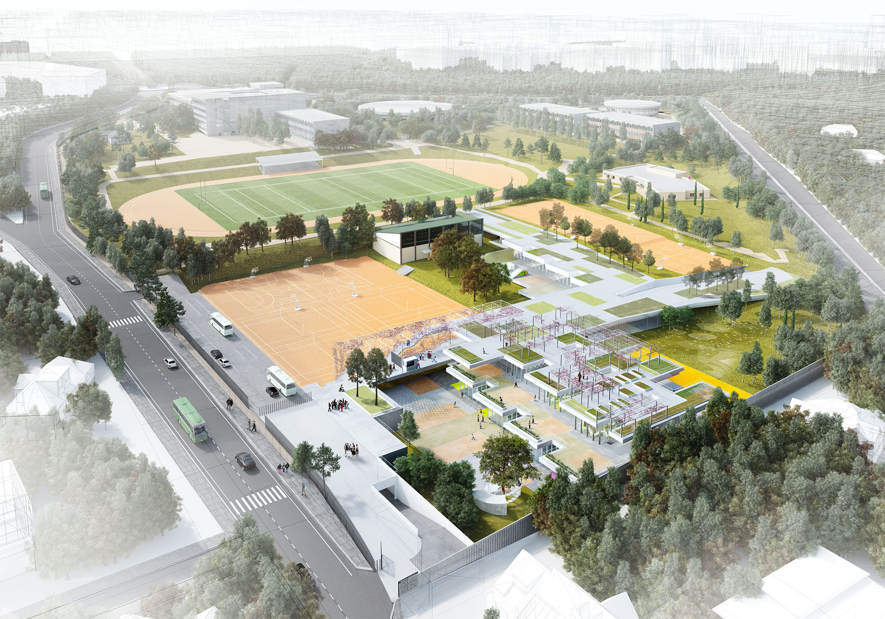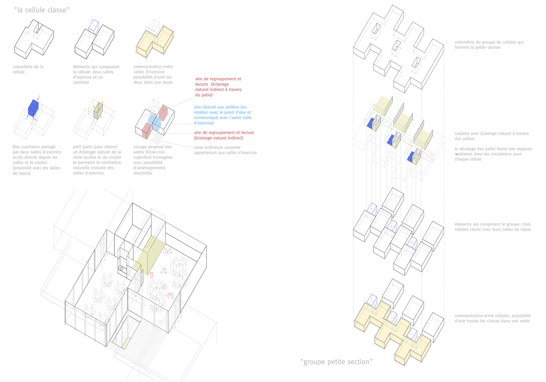 the different exempt pavilion buildings are presented as “objects” built in a landscaped environment that pedestrically connects them through roads and in turn makes them independent by the lushness of the plant mass. within this figure-bottom dichotomy, the proposal proposes the incorporation of the new program as part of the built topography or background plan, and thus collaborate to the rehabilitation of outdoor spaces, and reinforcement and improvement of the entrance spaces, internal routes and planted areas. the strong unevenness existing in the plot causes as a consequence that what is considered as a ground operation, however, has a “facade” or recognizable image of the building from the new access at the bottom point (avenida de los madroños). the provision of the program enhances passive environmental control solutions that make the correct orientation, use of shade its best allies, along with an atomized organization of small courtyards that put light into the heart of the spaces and allow natural cross ventilation, especially favorable in hot weather. the terraced solution produces the splitting of the floor plans in recreational gardens individualized by age and in turn becomes pedestrian connection planes that allow traffic both "through" and "over" the building.