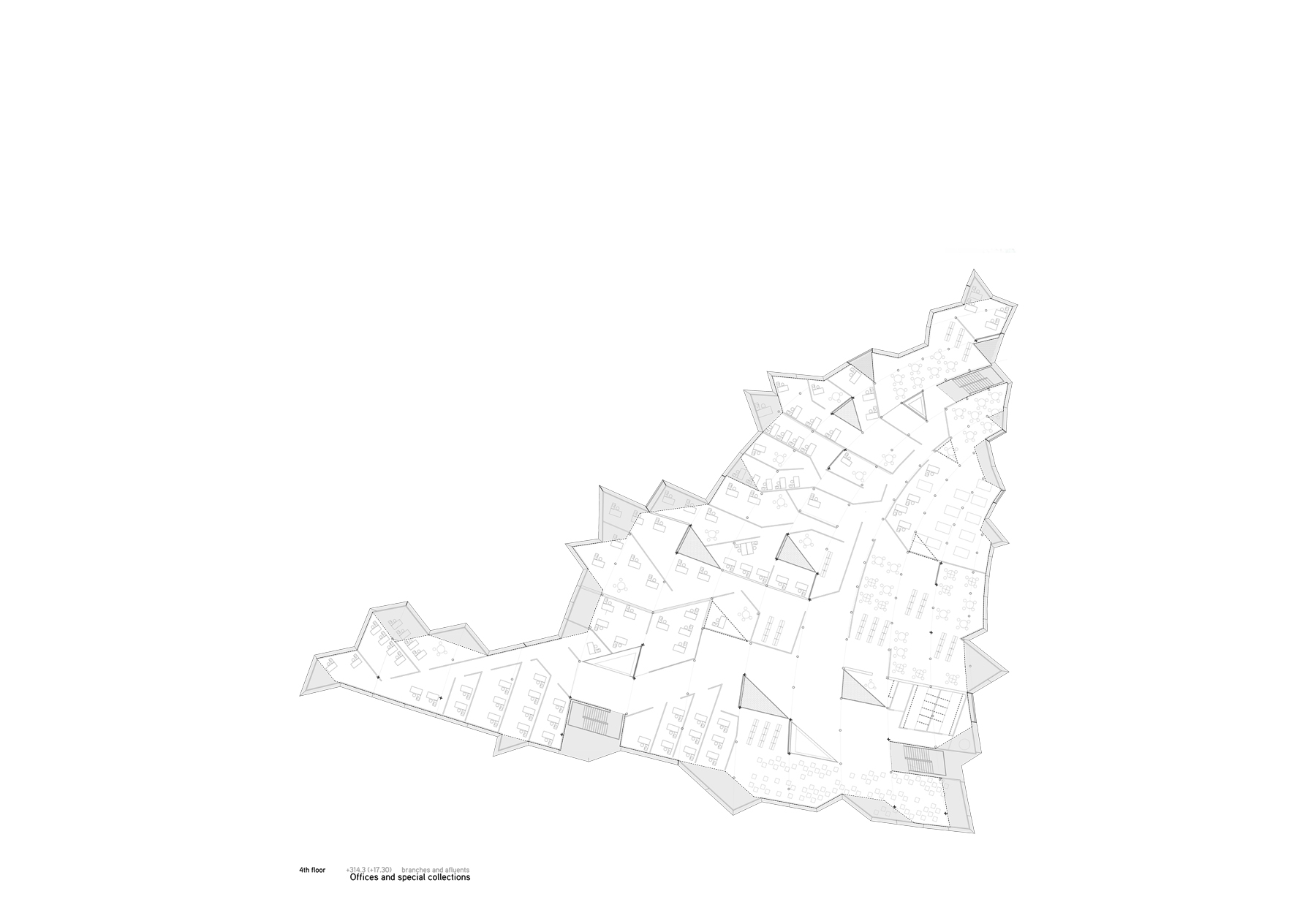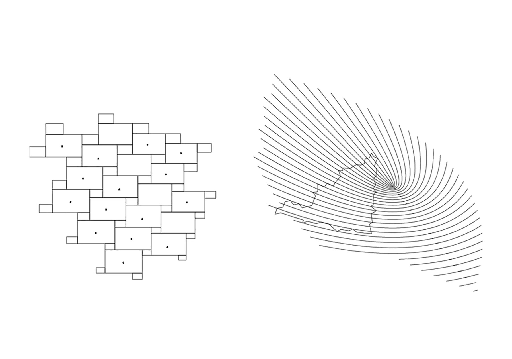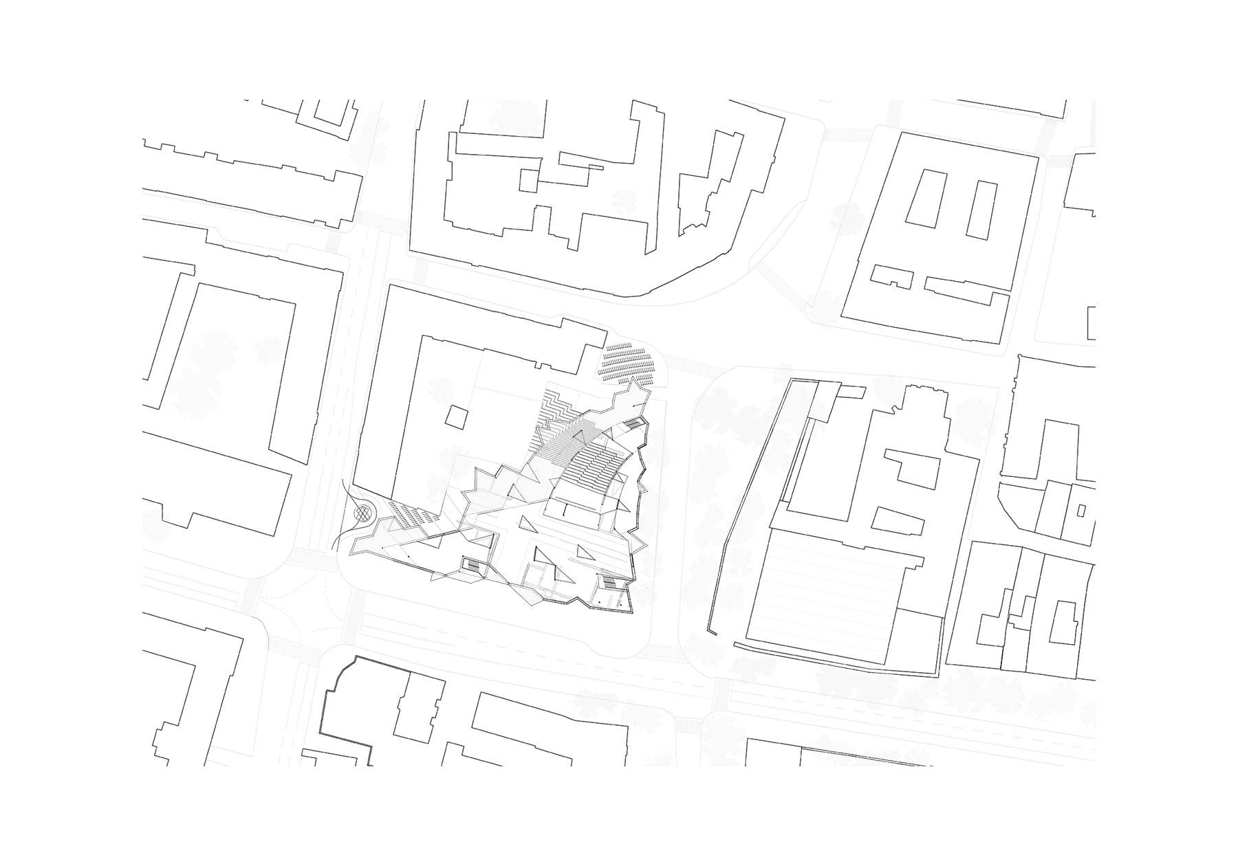 we propose a system of order capable to deal with variations and exceptions in a harmonious way. in this case we are working with a spiral mesh embedded in a grid of proportional golden rectangles. the gentle sense of rotation allow us to respond correctly to the triangular site, so there is no real front or back in the pure cartesian way but a more open and ambiguous yet controlled spatial condition.