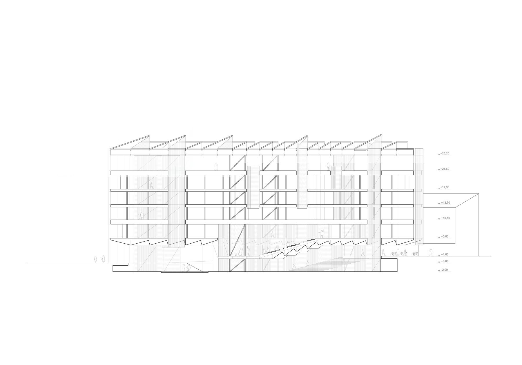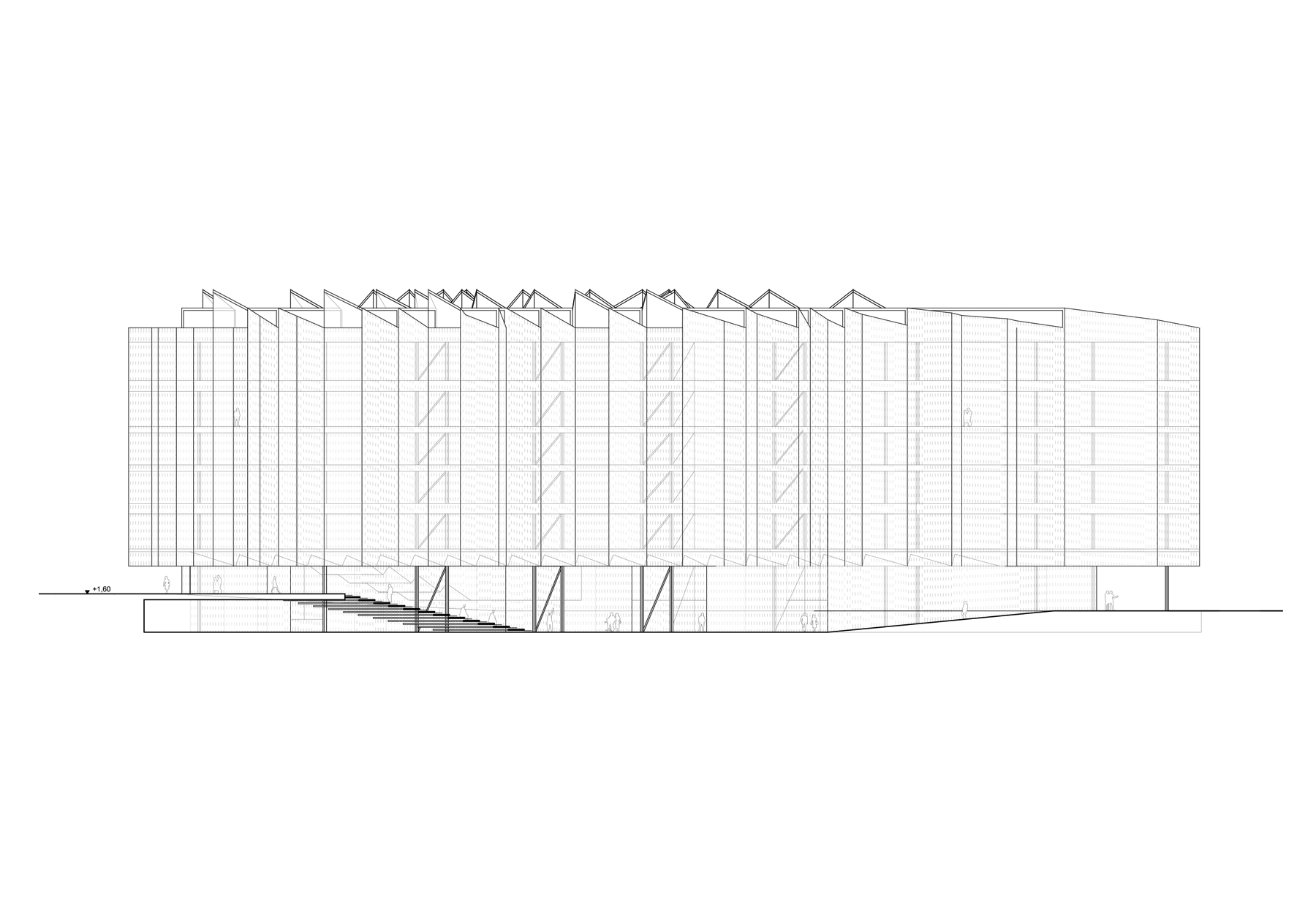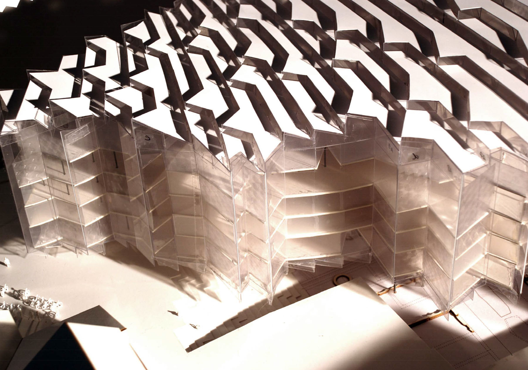 we propose a system of order capable to deal with variations and exceptions in a harmonious way. in this case we are working with a spiral mesh embedded in a grid of proportional golden rectangles. the gentle sense of rotation allow us to respond correctly to the triangular site, so there is no real front or back in the pure cartesian way but a more open and ambiguous yet controlled spatial condition.