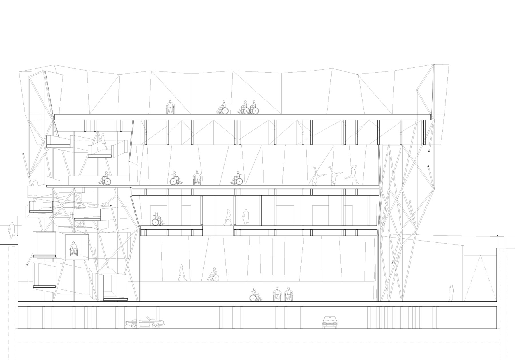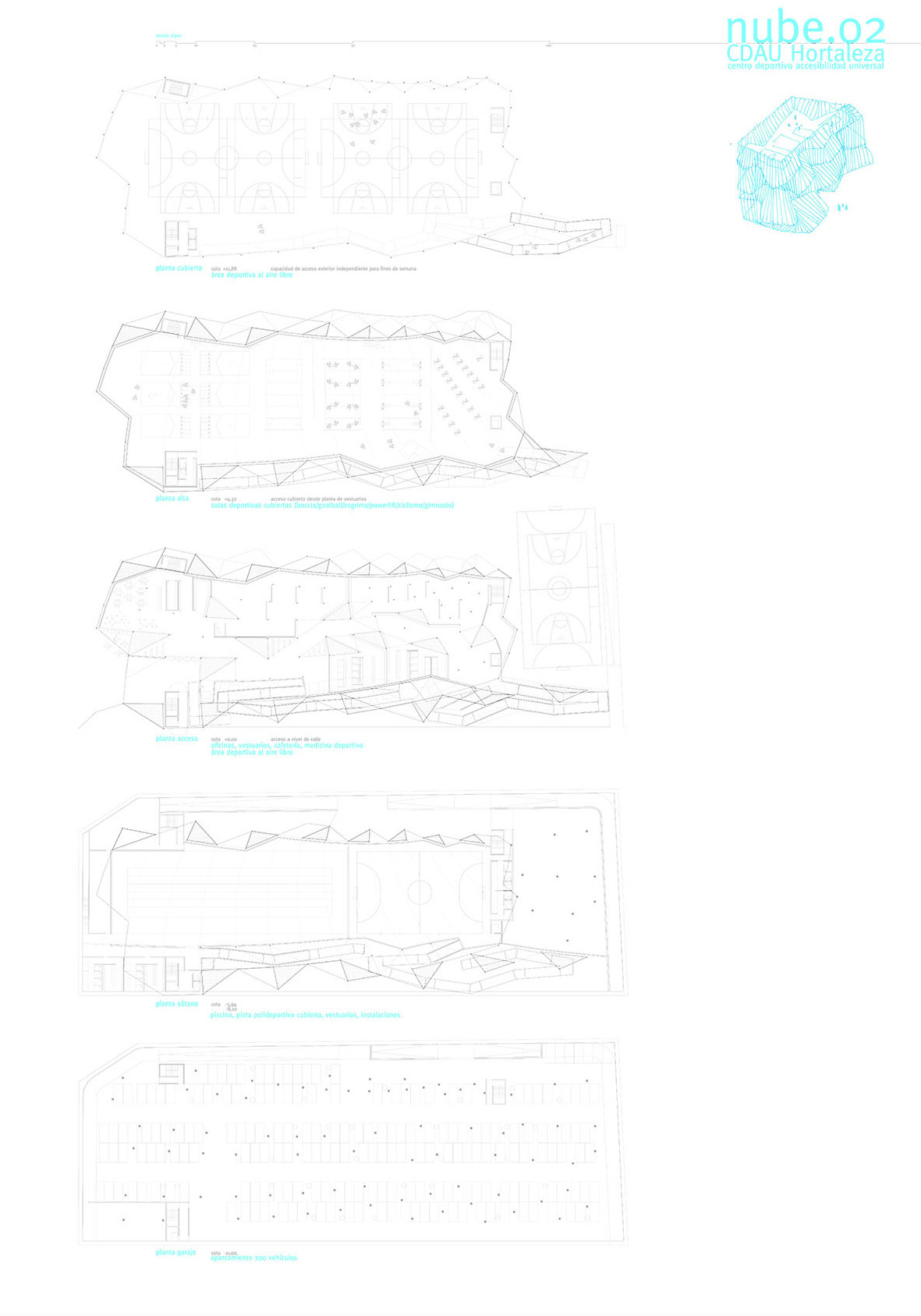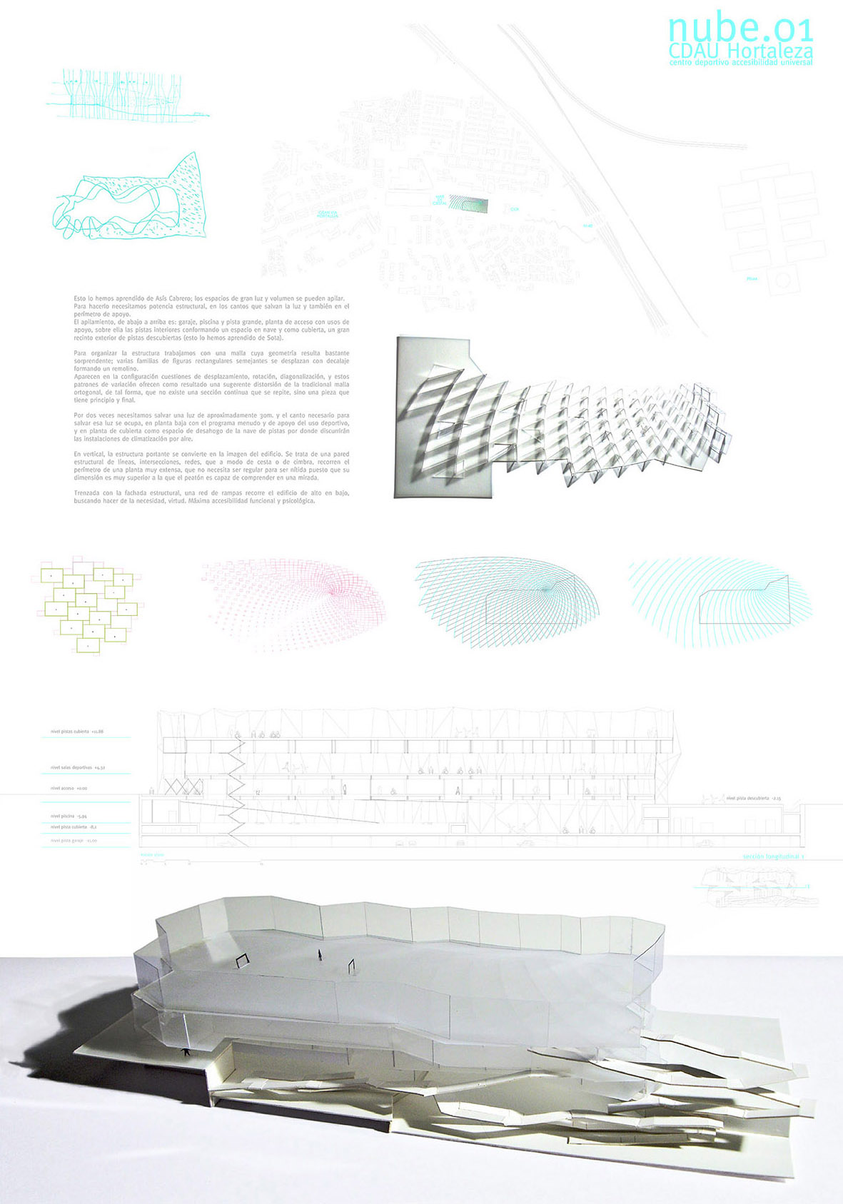 we have learned this from this asis cabrero; the spaces of great light and volume can be stacked. to do this we need structural power, in the corners that save the light and also in the perimeter of support. the stacking, from bottom to top is: garage, swimming pool and large track, access floor with supportive uses, on it the interior tracks forming a space in ship and as a cover, a large exterior enclosure of discovered tracks (we haver learned this from sota). to organize the structure we work with a mesh whose geometry is quite surprising; several families of similar rectangular figures move with offset forming a swirl.questions of displacement, rotation, diagonalization appear in the configuration, and these variation patterns offer as a result a suggestive distortion of the traditional orthogonal mesh, so that there is no continuous section that repeats, but a piece that has a beginning and final. vertically, the supporting structure becomes the image of the building. It is a structural wall of lines, intersections, networks, which, as a basket or formwork, run along the perimeter of a very large plant, which does not need to be regular to be clear since its dimension is much greater than that of the pedestrian is able to understand in a look. braided with the structural façade, a network of ramps runs through the building from high to low, seeking to make the need virtue. maximum functional and psychological accessibility.