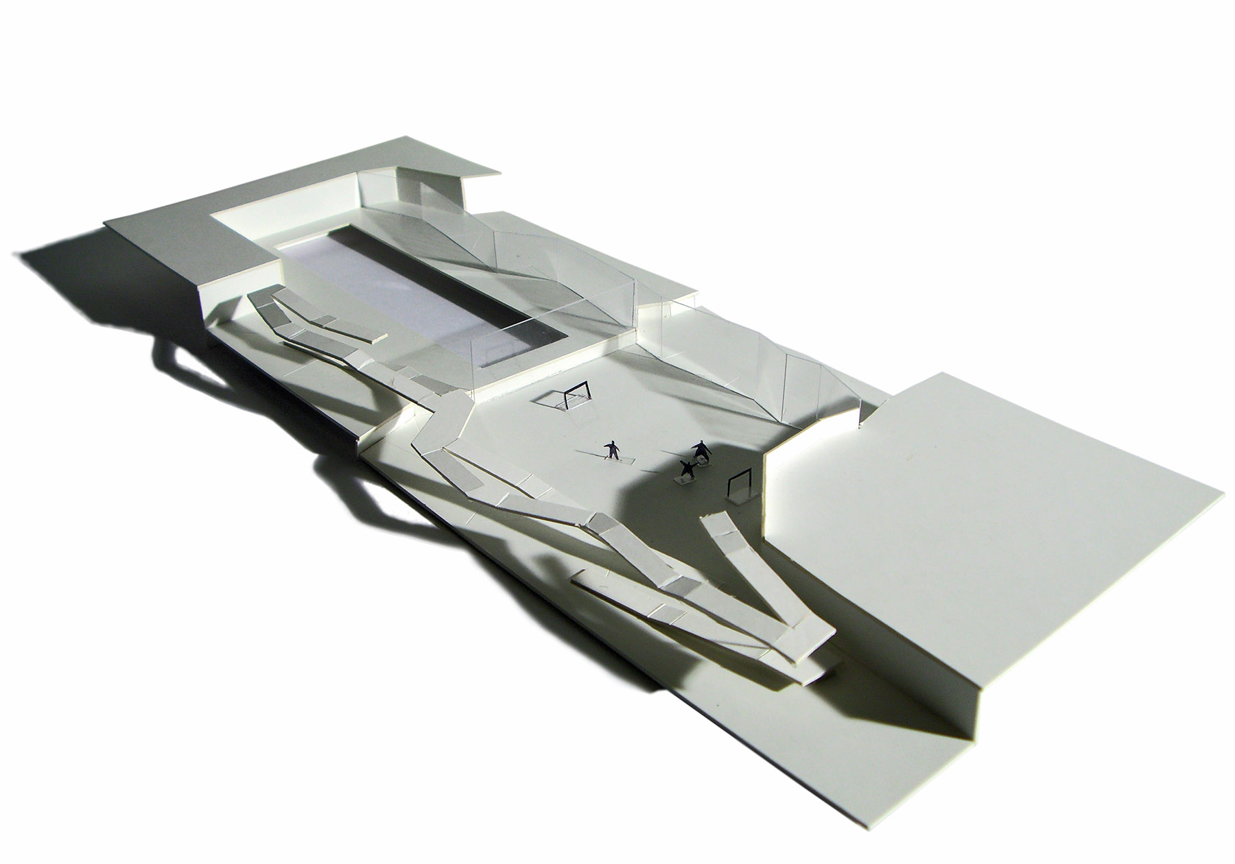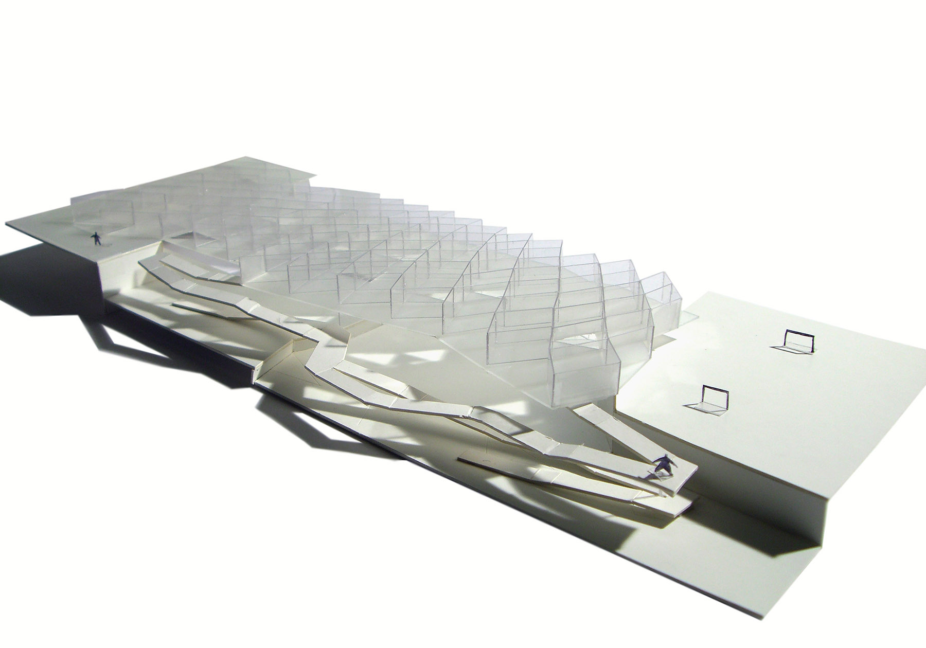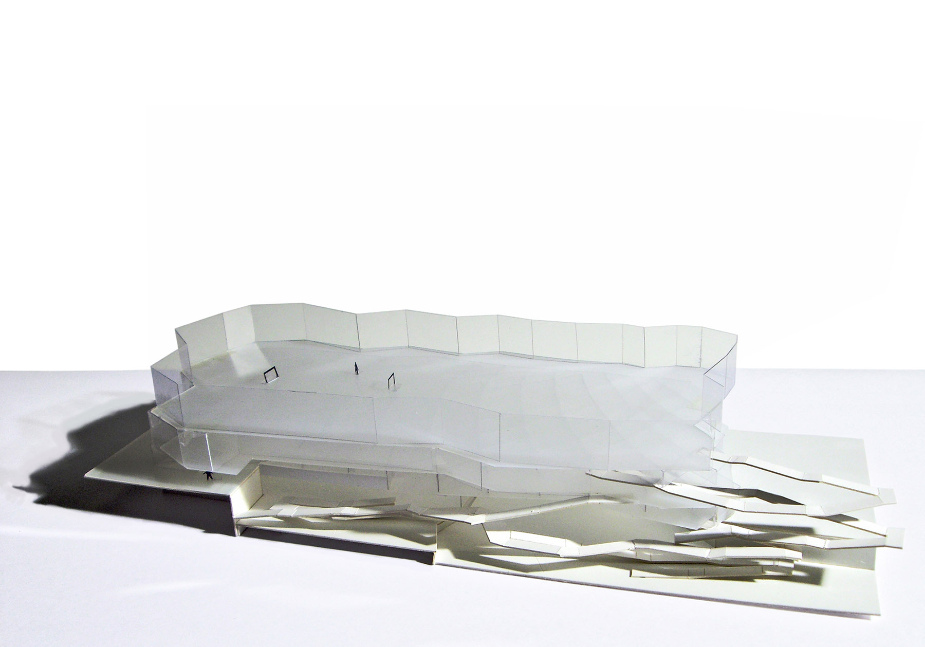 we have learned this from this asis cabrero; the spaces of great light and volume can be stacked. to do this we need structural power, in the corners that save the light and also in the perimeter of support. the stacking, from bottom to top is: garage, swimming pool and large track, access floor with supportive uses, on it the interior tracks forming a space in ship and as a cover, a large exterior enclosure of discovered tracks (we haver learned this from sota). to organize the structure we work with a mesh whose geometry is quite surprising; several families of similar rectangular figures move with offset forming a swirl.questions of displacement, rotation, diagonalization appear in the configuration, and these variation patterns offer as a result a suggestive distortion of the traditional orthogonal mesh, so that there is no continuous section that repeats, but a piece that has a beginning and final. vertically, the supporting structure becomes the image of the building. It is a structural wall of lines, intersections, networks, which, as a basket or formwork, run along the perimeter of a very large plant, which does not need to be regular to be clear since its dimension is much greater than that of the pedestrian is able to understand in a look. braided with the structural façade, a network of ramps runs through the building from high to low, seeking to make the need virtue. maximum functional and psychological accessibility.