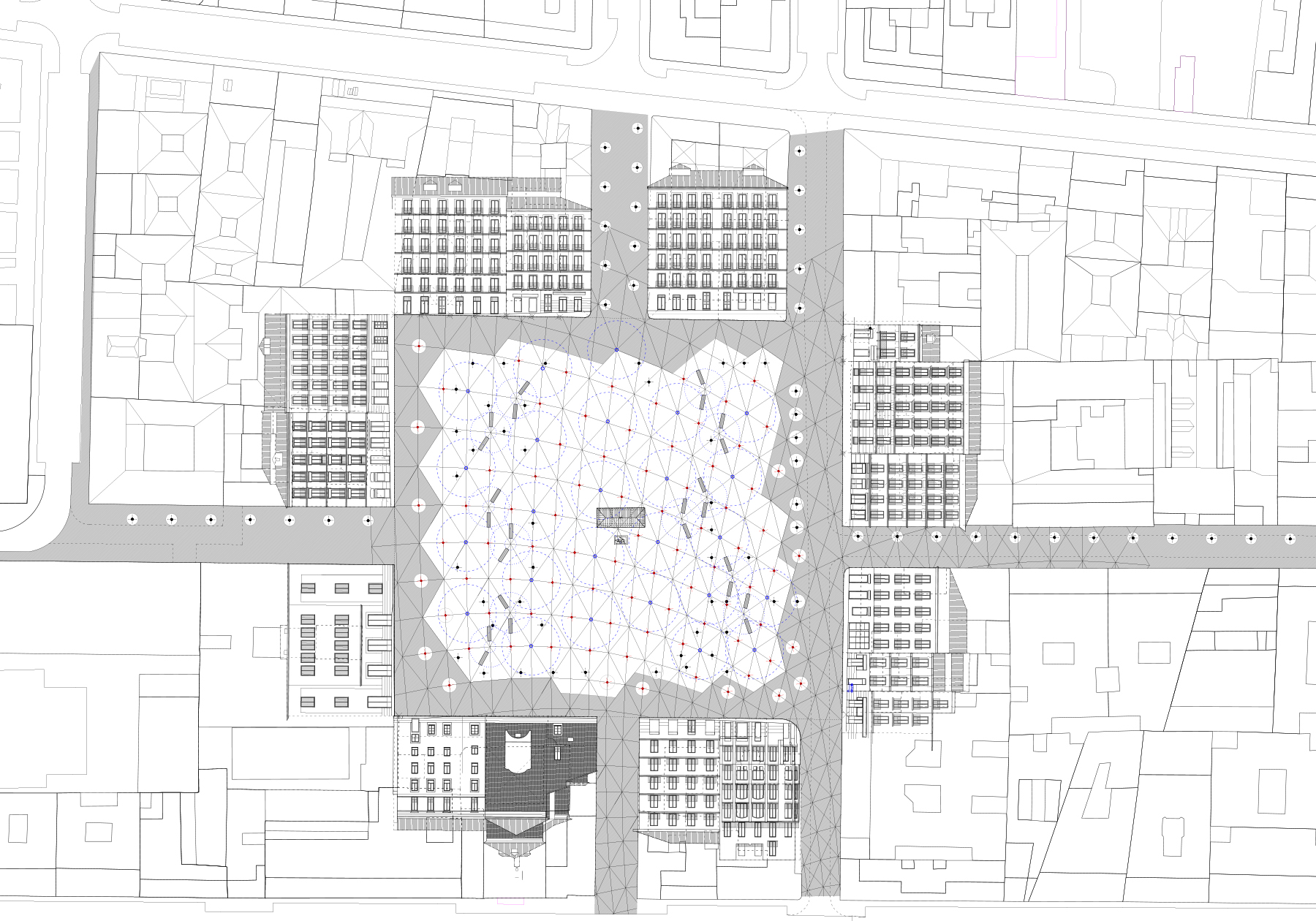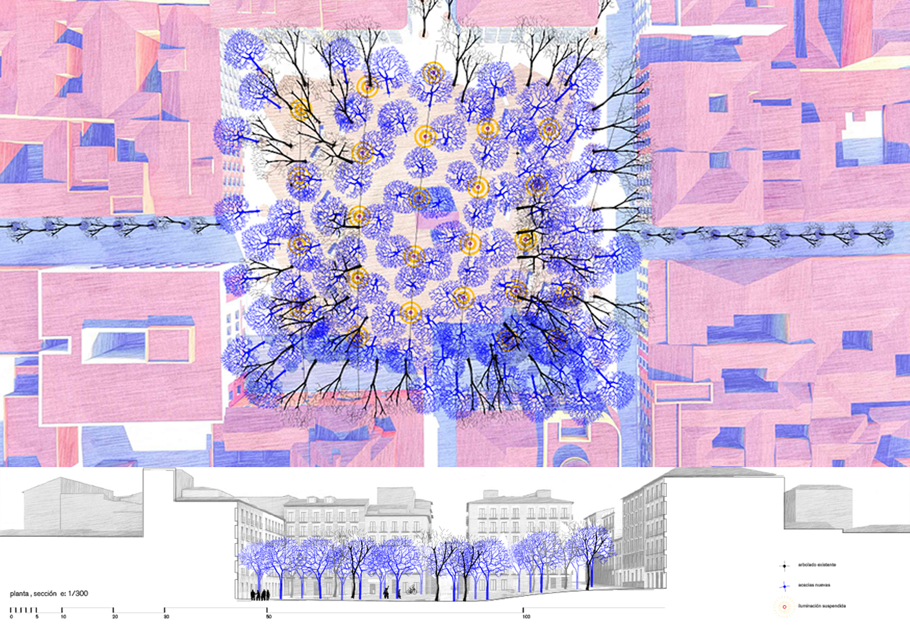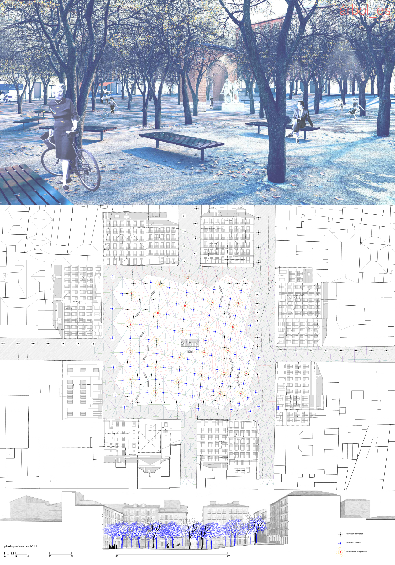 Intertwined with the branches, 25 light fixtures suspended from a network of cables leave the ground free of added elements. The only vertical elements in the space are the tree trunks. These lights are the same as those on Gran Vía; they are a model approved by the City Council, but suspended instead of on a pole. They are distributed in a substantially uniform manner throughout the plaza, without forming a matrix. There are also benches floating on this large, smooth plane. 36 in particular are made of wood and allow water to flow through. They orient themselves like boats in bays, practically in the same direction.