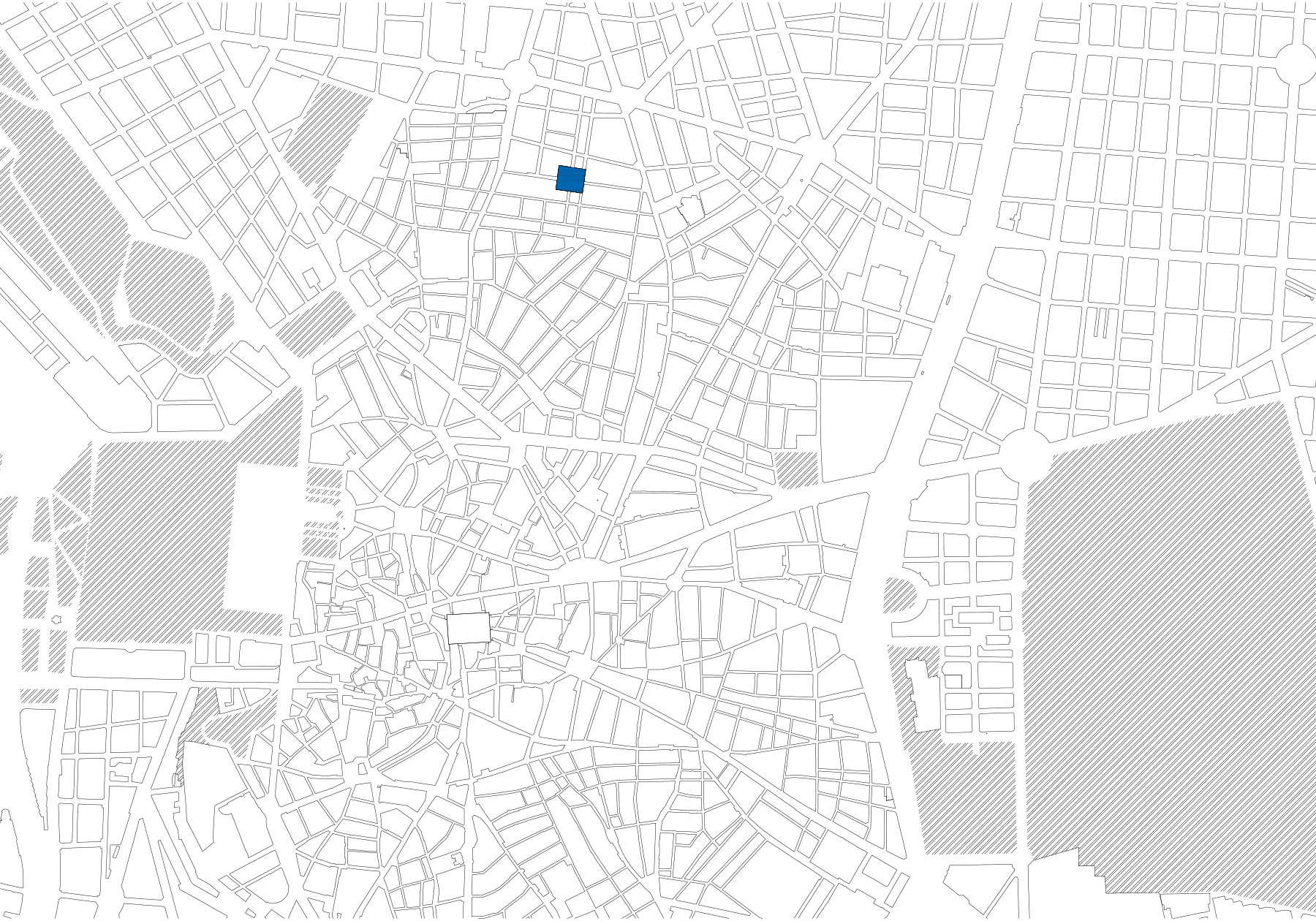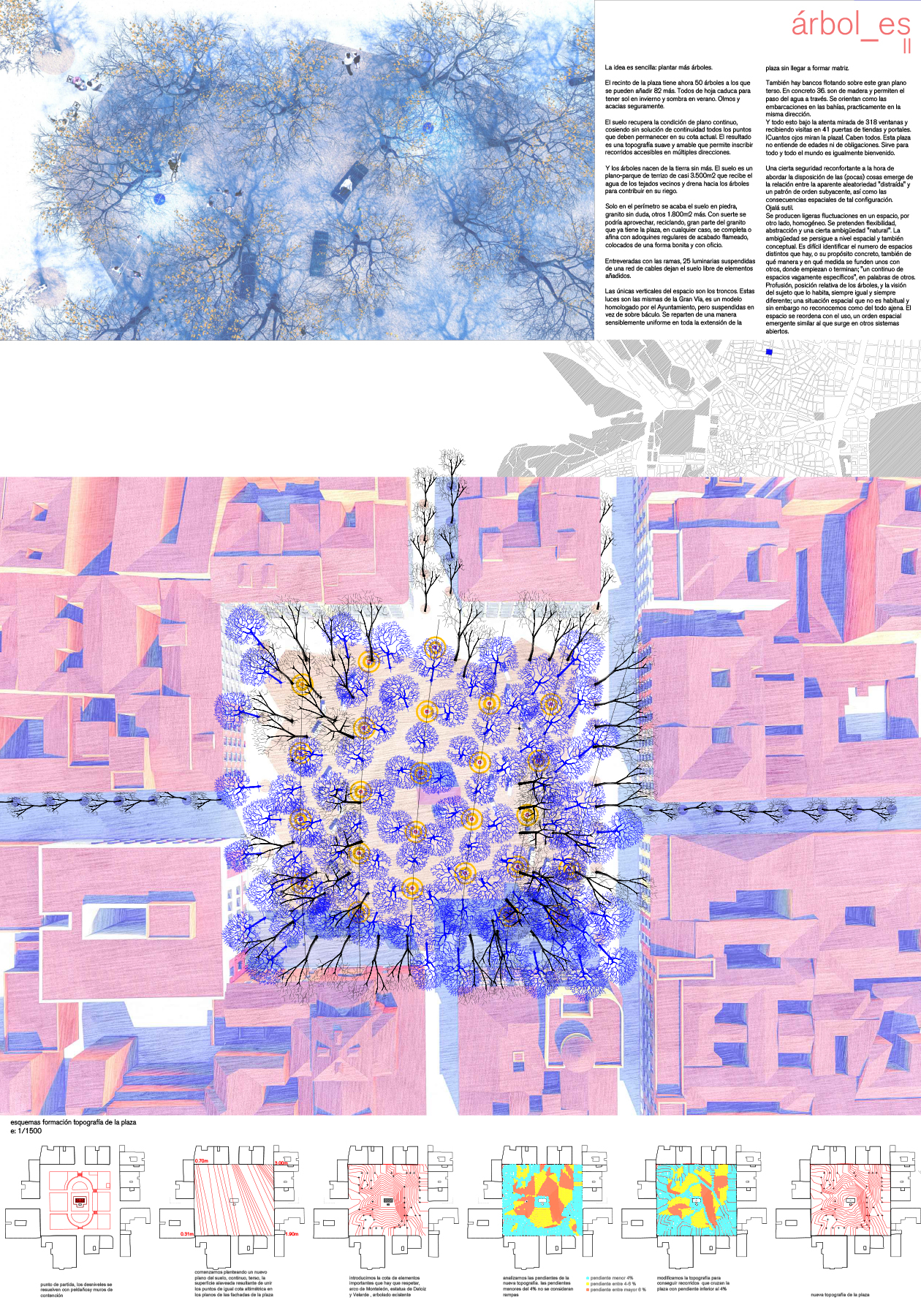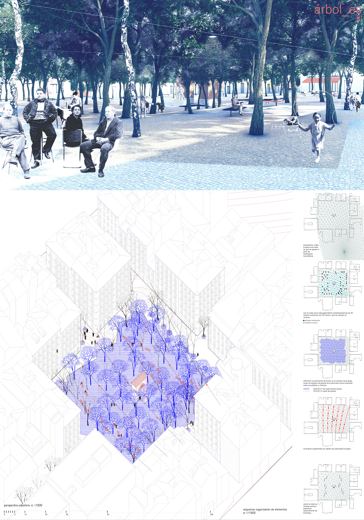 Intertwined with the branches, 25 light fixtures suspended from a network of cables leave the ground free of added elements. The only vertical elements in the space are the tree trunks. These lights are the same as those on Gran Vía; they are a model approved by the City Council, but suspended instead of on a pole. They are distributed in a substantially uniform manner throughout the plaza, without forming a matrix. There are also benches floating on this large, smooth plane. 36 in particular are made of wood and allow water to flow through. They orient themselves like boats in bays, practically in the same direction.