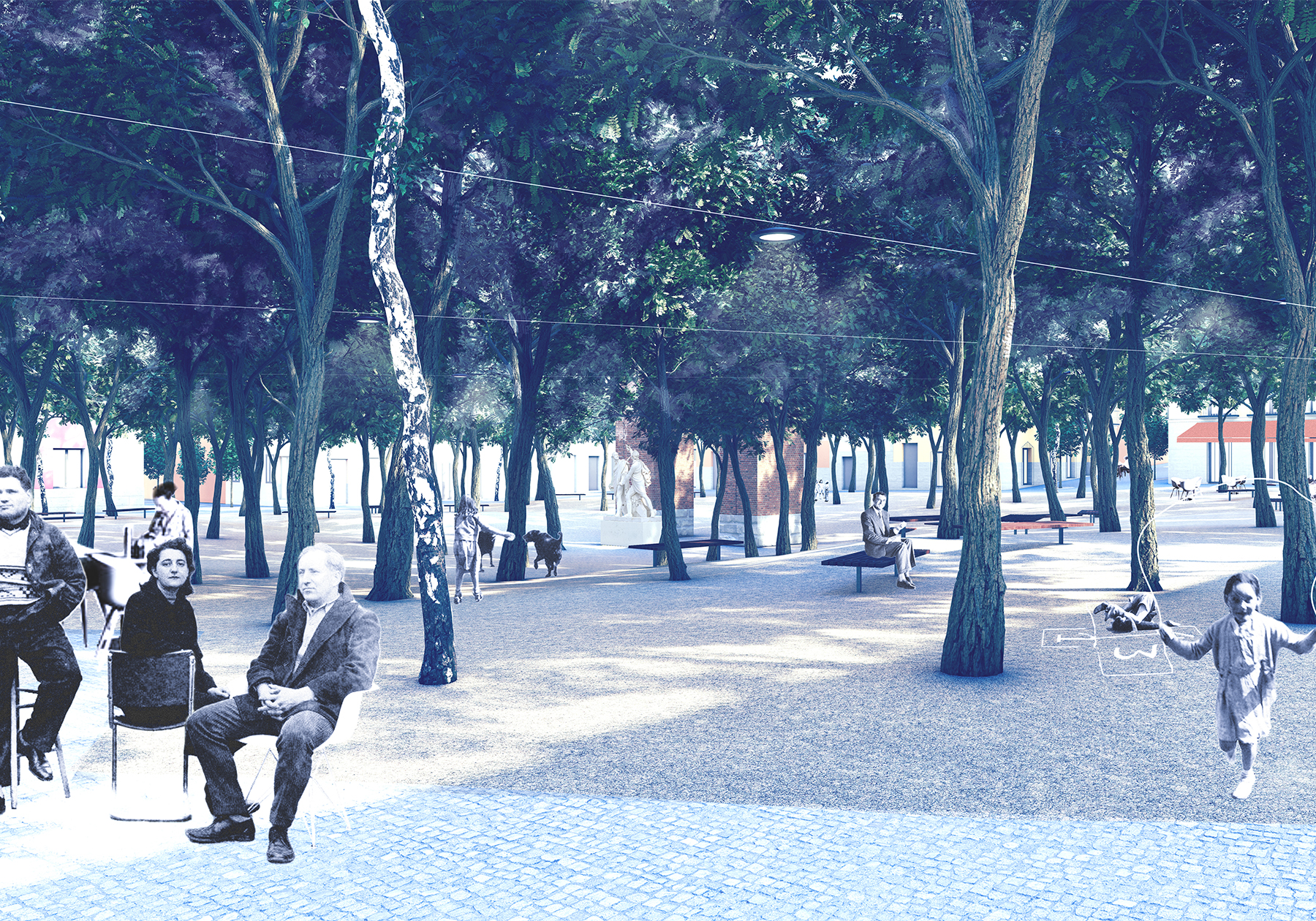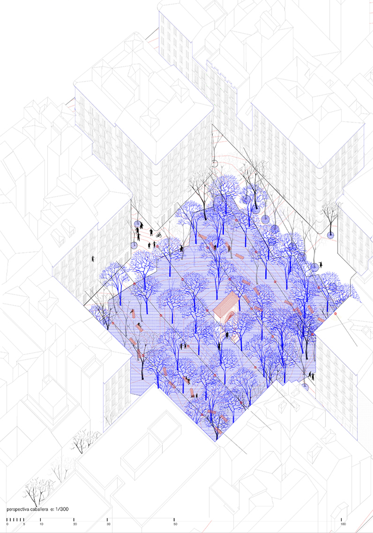 And the trees simply grow from the ground. The ground is a flat, earthen park of almost 3,500 m2 that receives water from neighboring roofs and drains toward the trees to contribute to their irrigation.