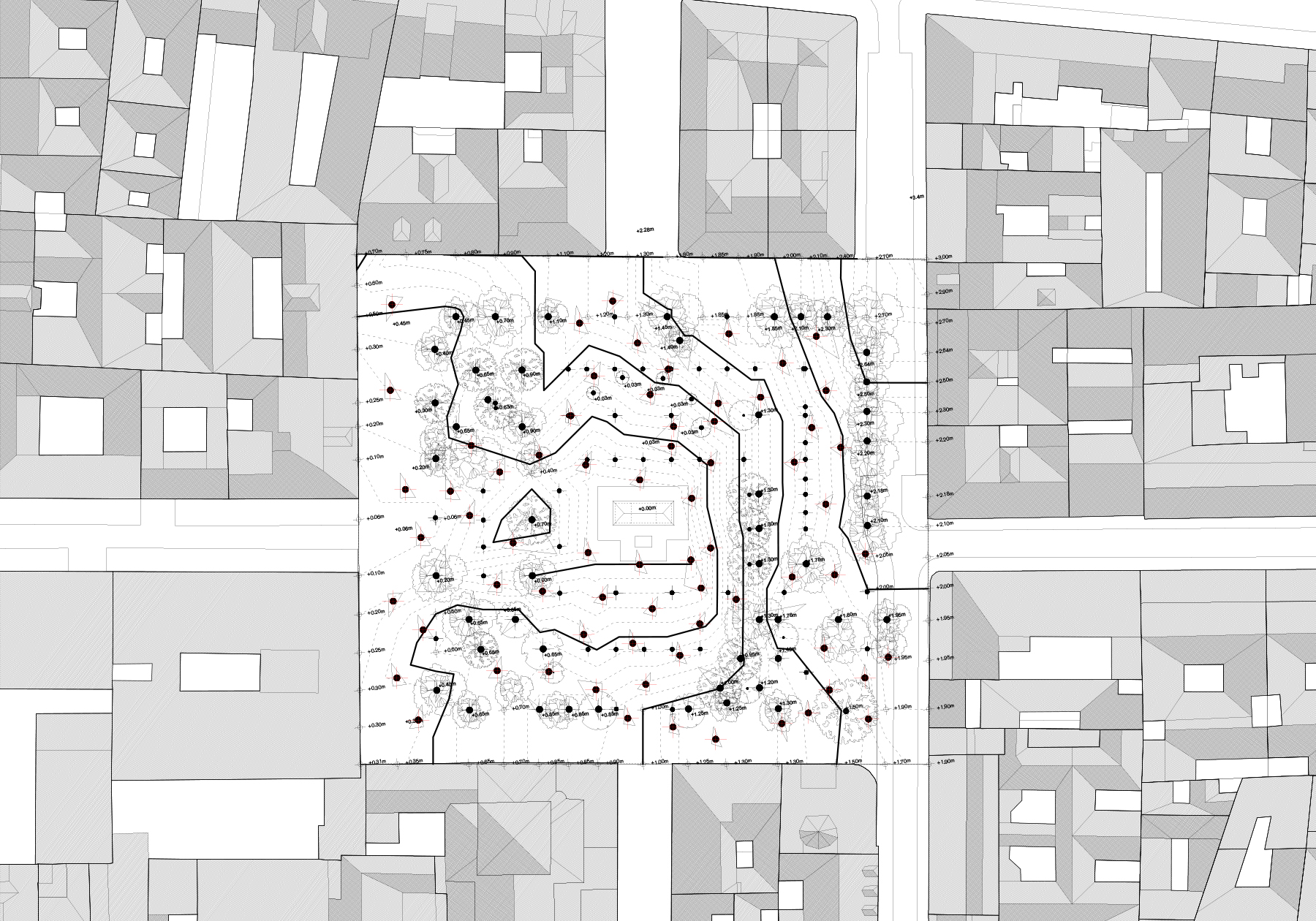 The ground regains its continuous plane, seamlessly stitching together all the points that must remain at their current level. The result is a smooth, gentle topography that allows for accessible paths in multiple directions.