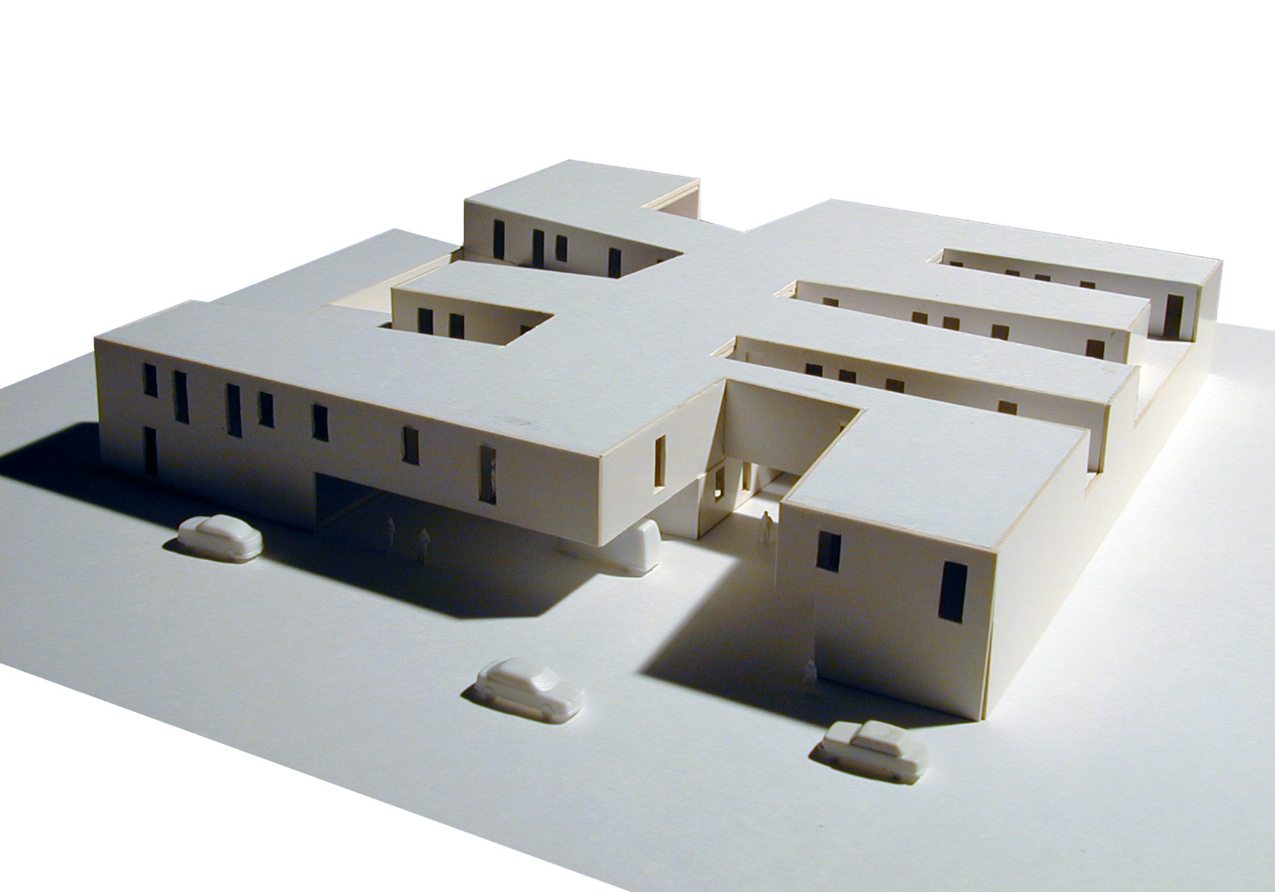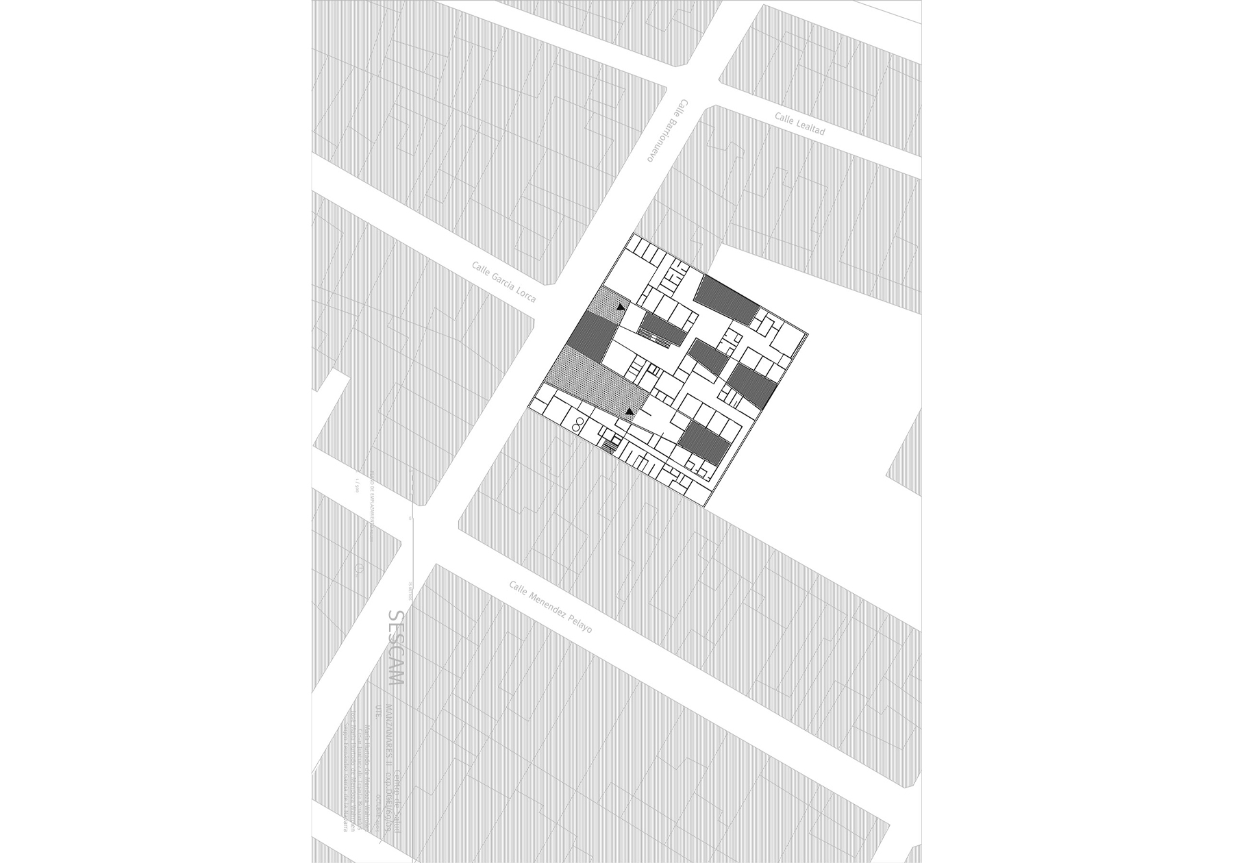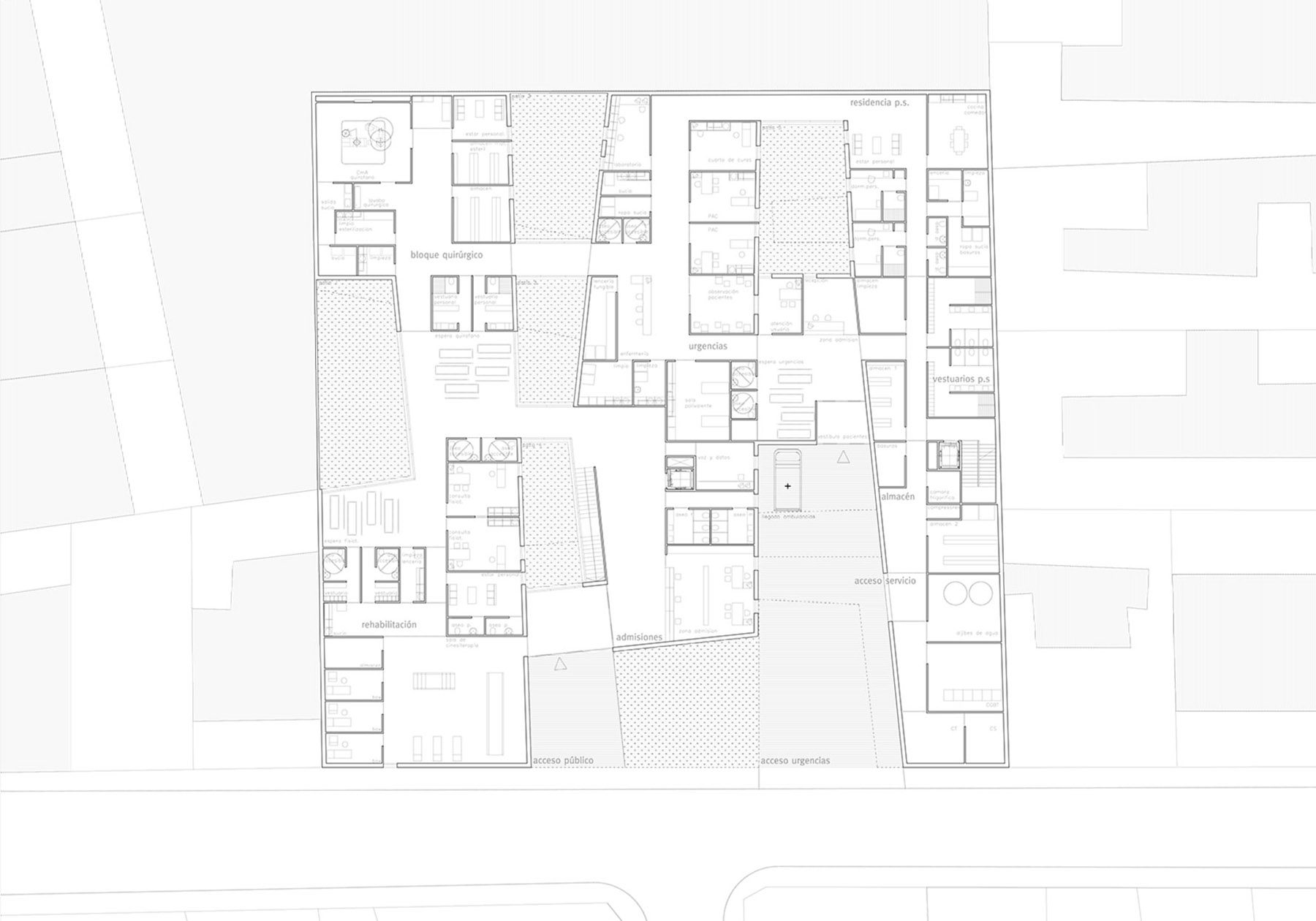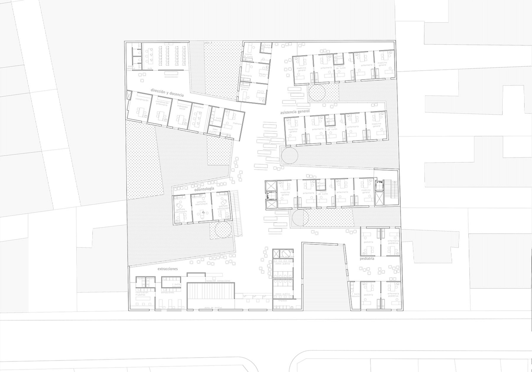 opposite to canonical solutions ordered by means of parallel and perpendicular bays to the façade by means of the comb-shaped arrangement, we have tried to respond to each of the conditions of the program that both on the ground floor and on the top, have seemed more relevant to the time to project the global solution. thus, based on the decision to manage the total footprint of the site, we have acted by modifying the perimeter of the plot, creating a series of courtyards that modify the condition of mediations of the three interior boundaries, allowing the new health center to act as an exempt building or as a building between medians depending on the accompaniment granted by the annexed buildings over time, resolving contact with their neighbors without scars. this scheme is completed with the inclusion of the necessary circulations to communicate the urgency with the surgical block or the residence of doctors with the urgency, which introduce a second level of movement, perpendicular to the previous one.