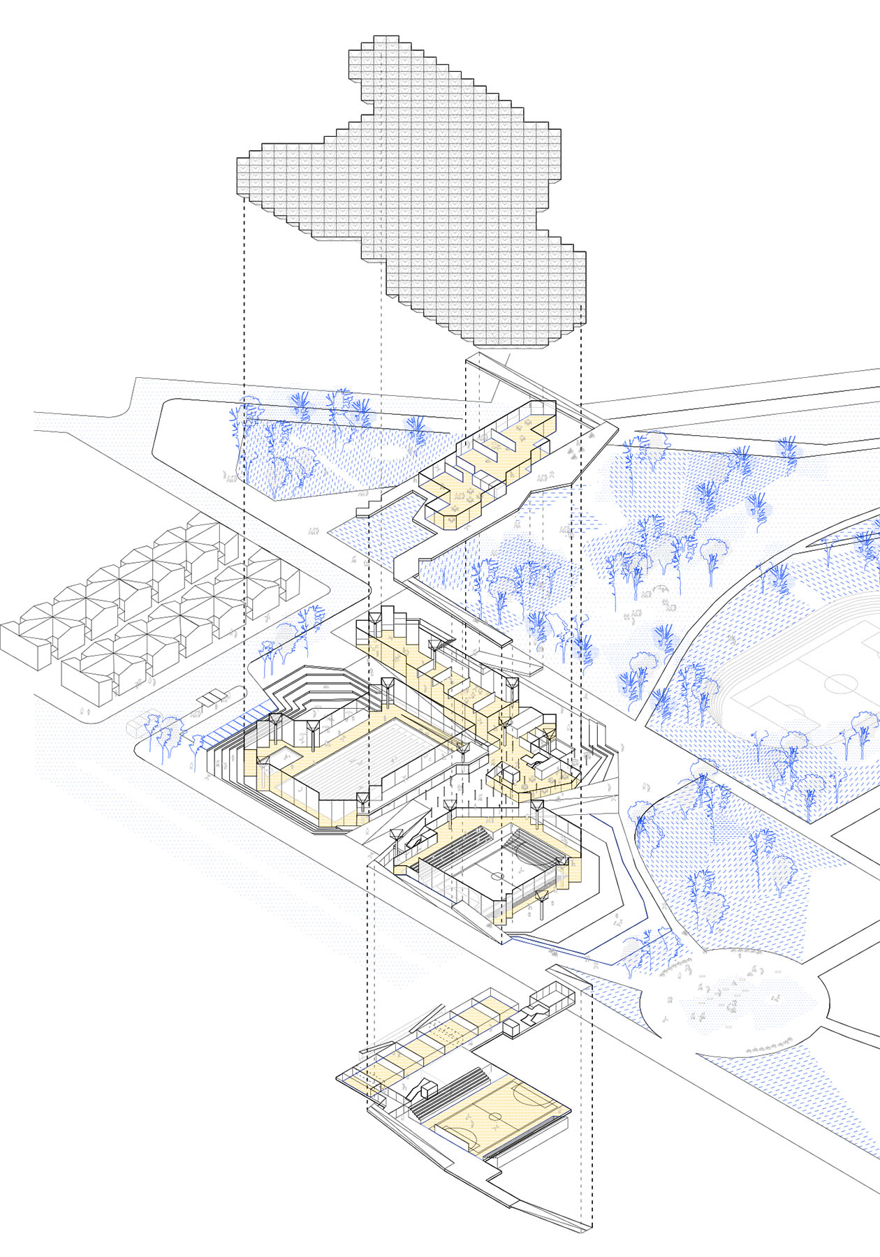 -sports spaces meet slightly to soften the impact of their height, building a new accessible topography that results in better integration into the park.