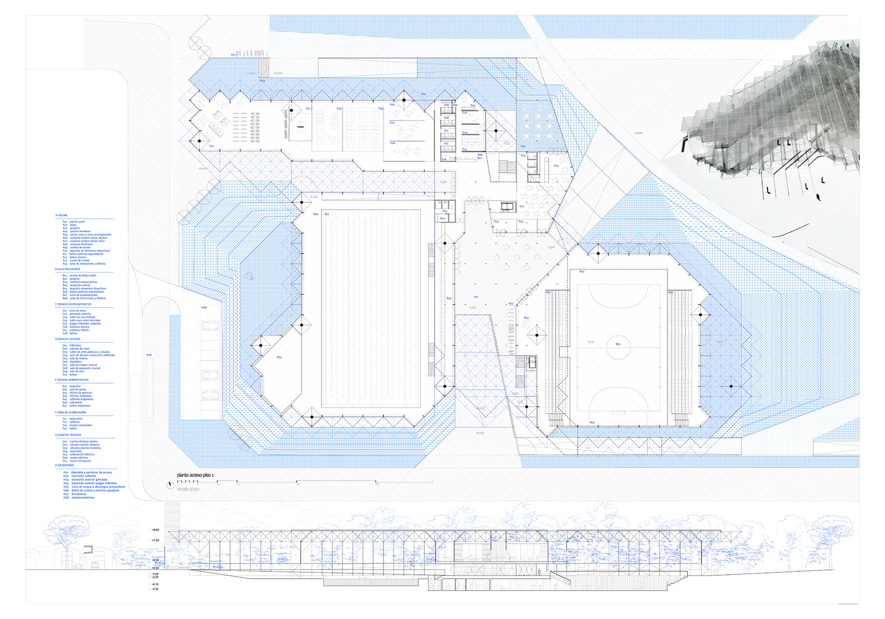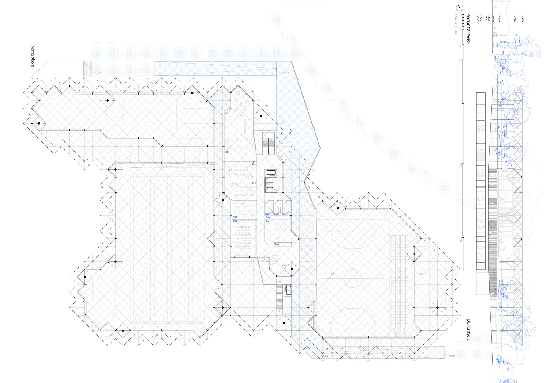 -the different pieces of the program are sewn by means of a structure with a light roof, shade and shelter that gives the whole the spatial quality of continuous occupable, covered or permeable according to zones.