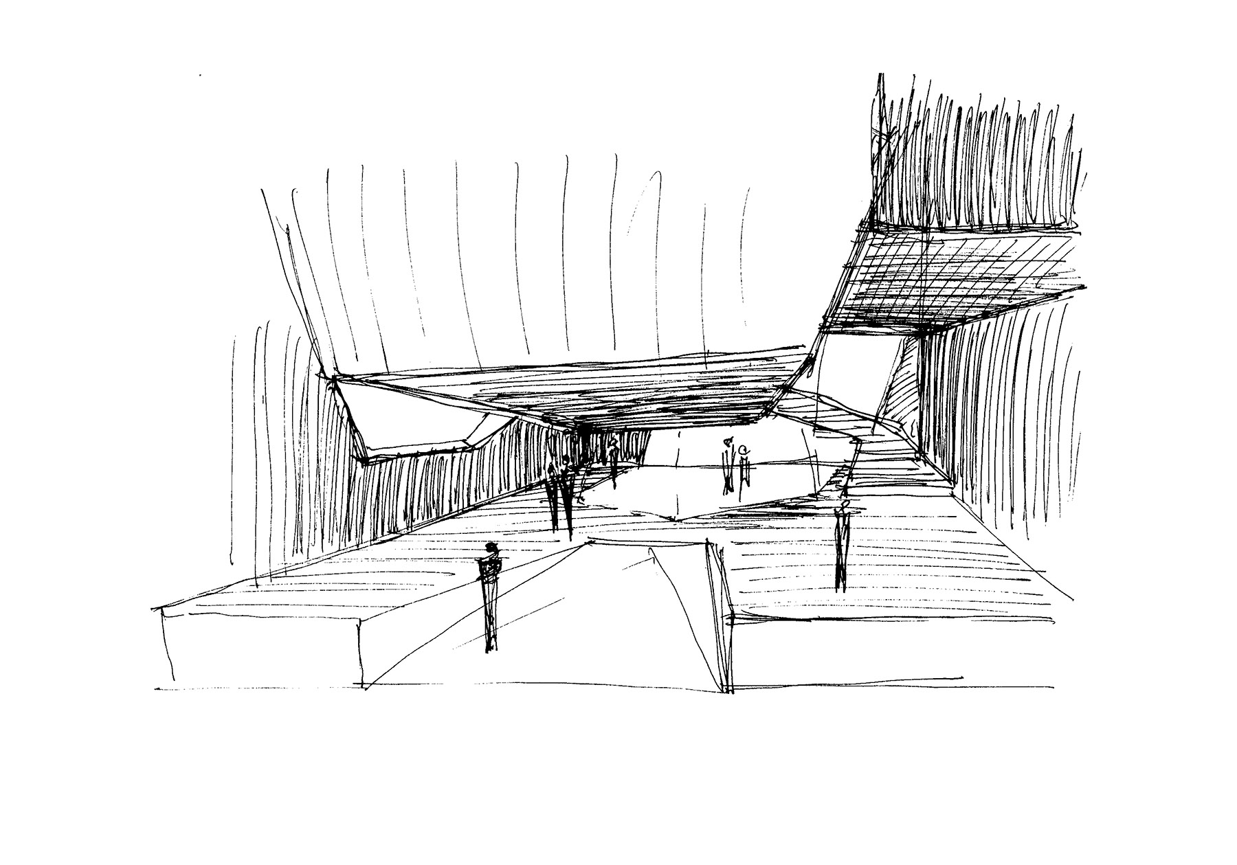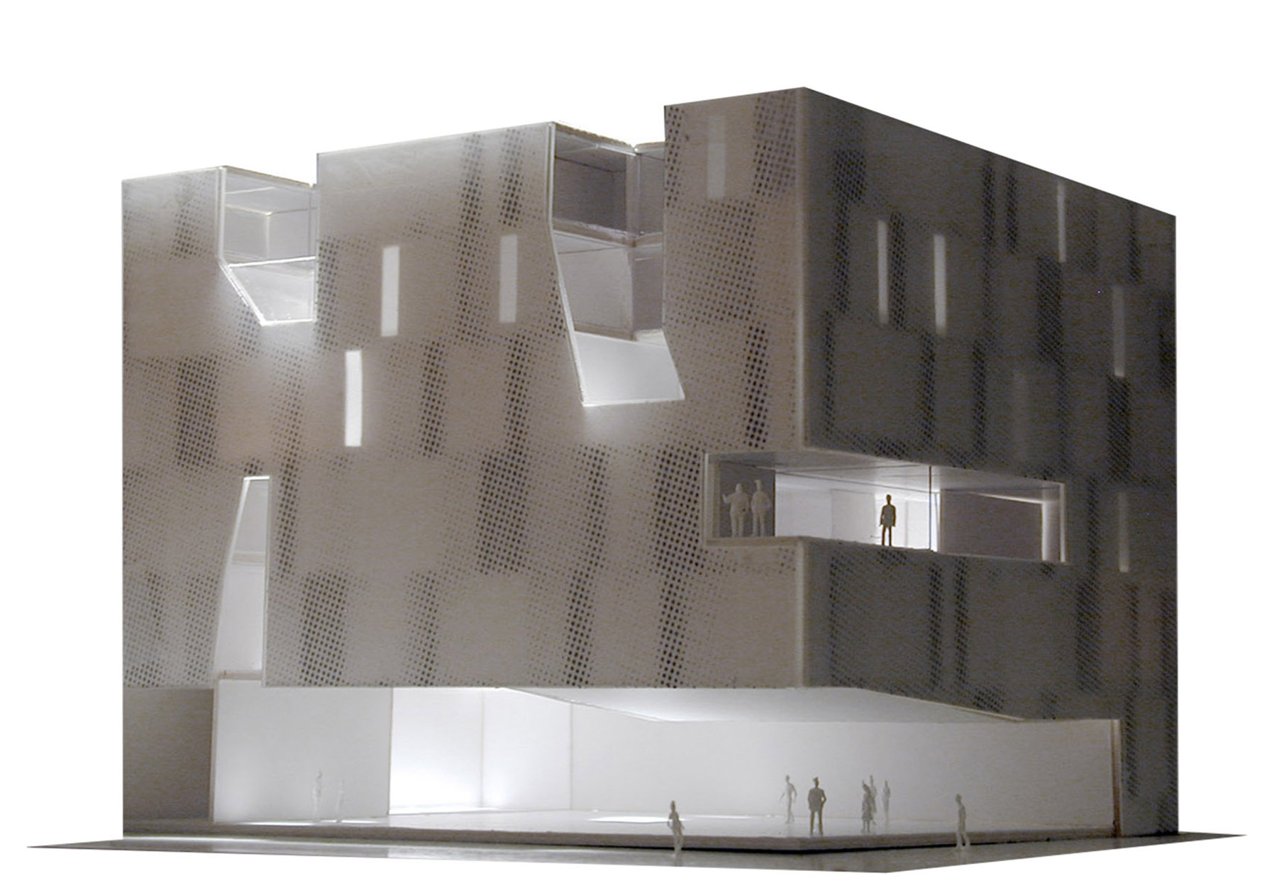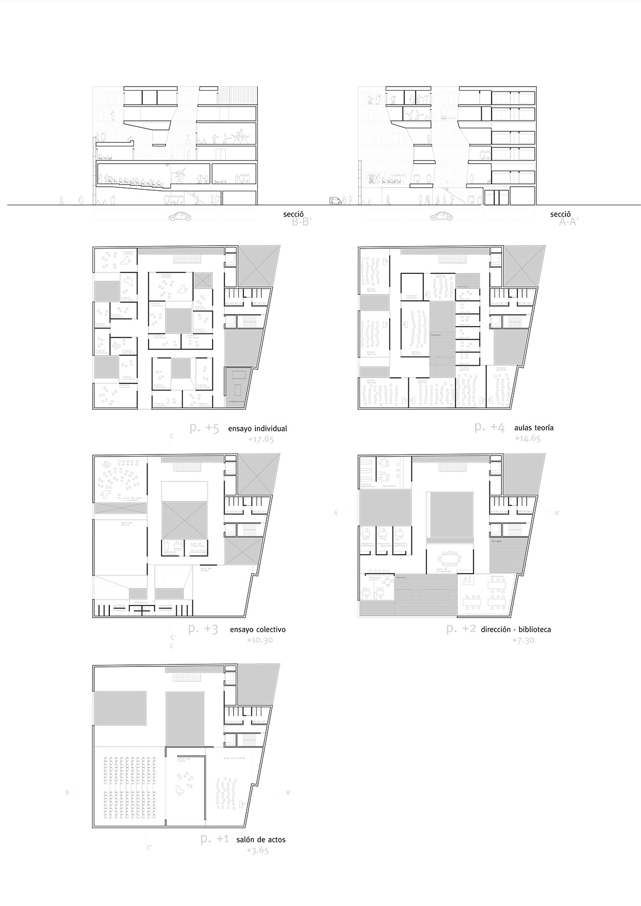 on the other hand, the conservatory program is set out in thematic blocks that need to be related to achieve a unitary project without differentiated parts. in this way we decided to merge the dance and music programs and then establish a new functional hierarchy in height; lower public traffic as it rises (also smaller rooms). in addition, the geometry of the site, practically square, together with the fact that it is a corner, hinders the traditional understanding of “front and back”, “left and right” and suggests the need to drill the large volume that can be offers to put light and air to the heart of an almost isotropic mass. these drillings are one or multiple, it is a braid of gaps that define spaces by their relative position.